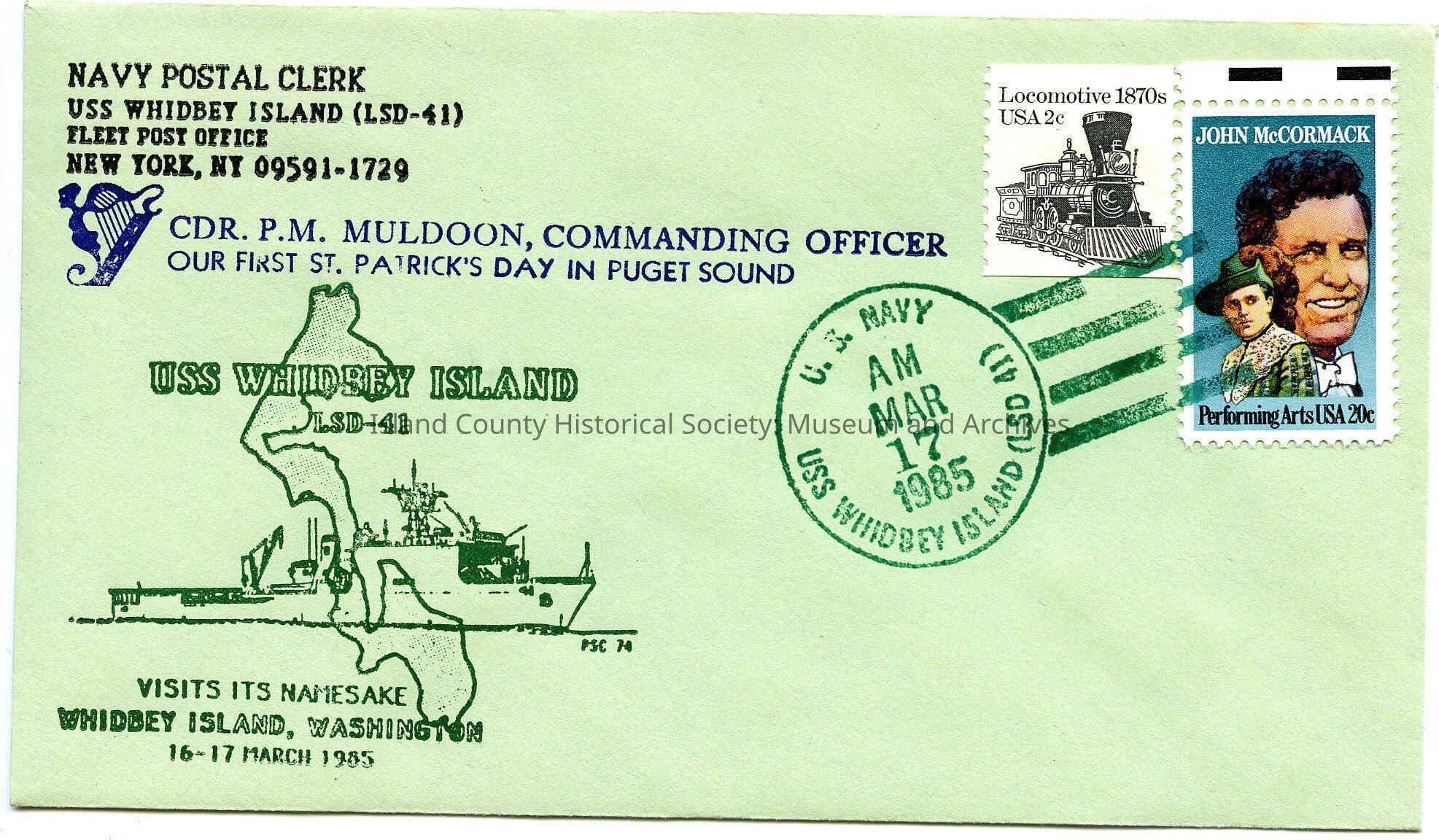 Small envelope with U.S.S. Whidbey Island, LSD-41, Load Ship Deck, Lead Ship of the Class for the United States Navy. Postmarked from U.S. Navy USS Whidbey Island (LSD 41) Mar 17 1985.