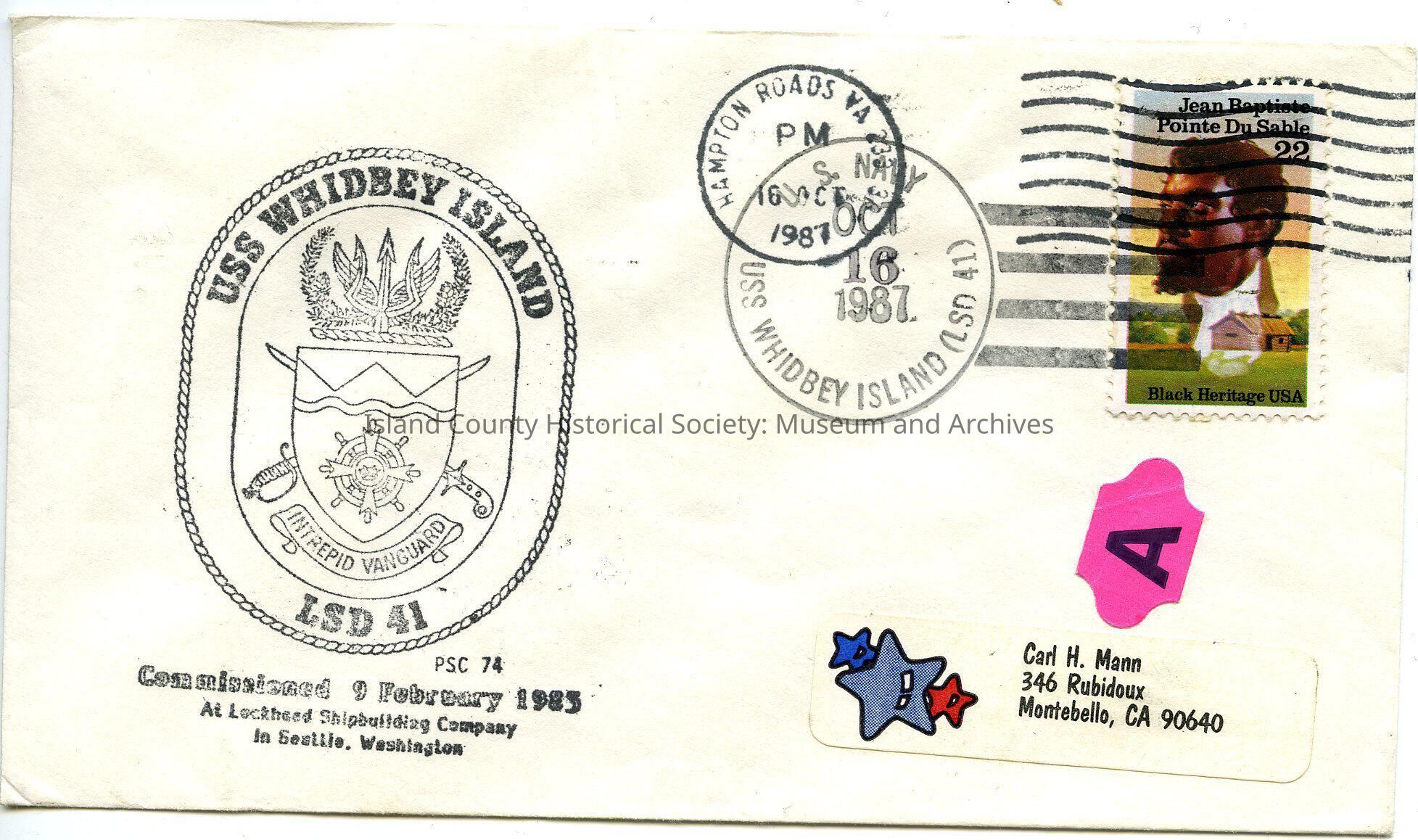 Small envelope with U.S.S. Whidbey Island, LSD-41, Load Ship Deck, Lead Ship of the Class for the United States Navy. Postmarked from U.S. Navy USS Whidbey Island (LSD 41) Oct 16, 1987. Also postmarked Hampton Roads, VA 16 Oct 1987.