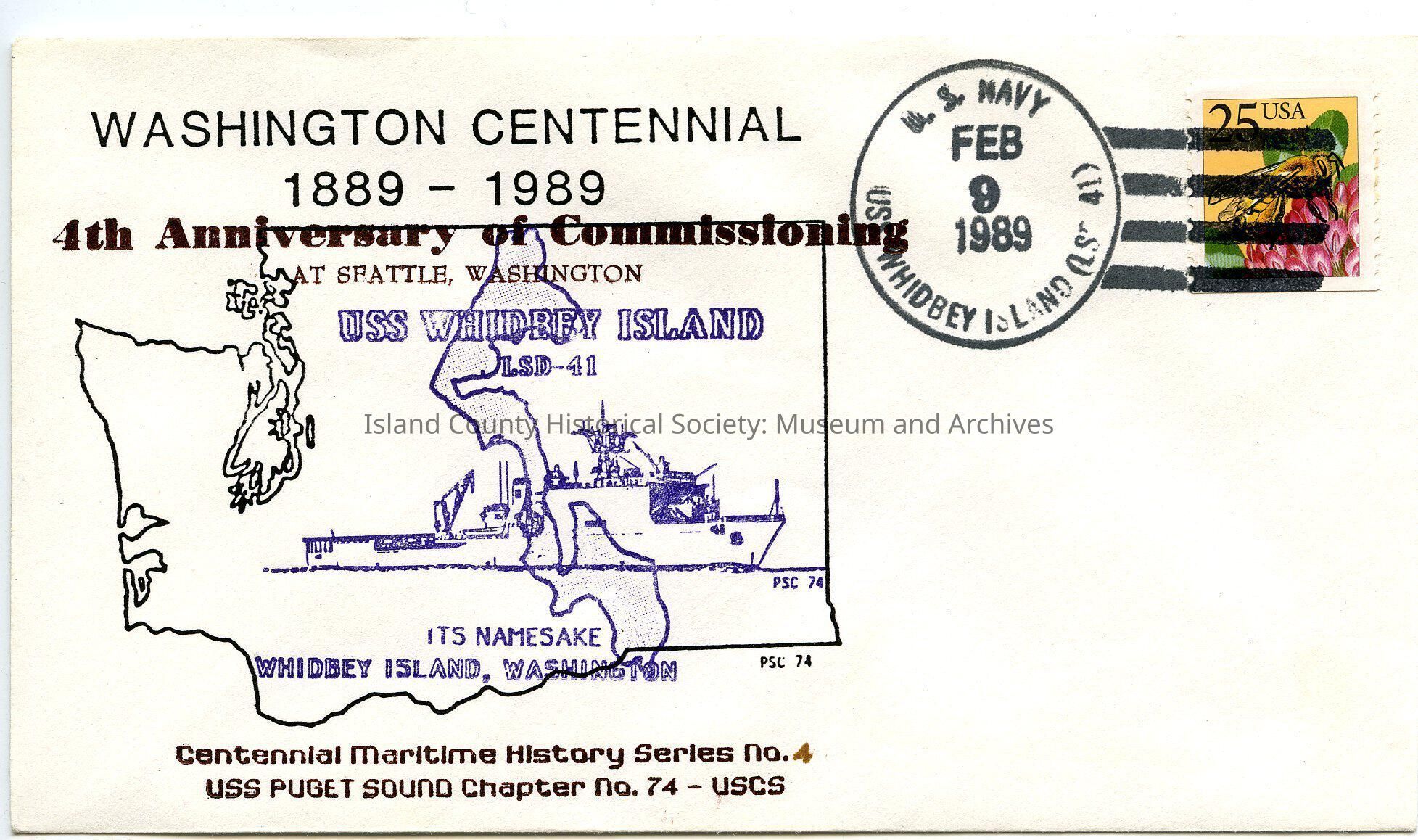 Small envelope with U.S.S. Whidbey Island, LSD-41, Load Ship Deck, Lead Ship of the Class for the United States Navy. Postmarked from U.S. Navy USS Whidbey Island (LSD 41) Feb 9, 1989