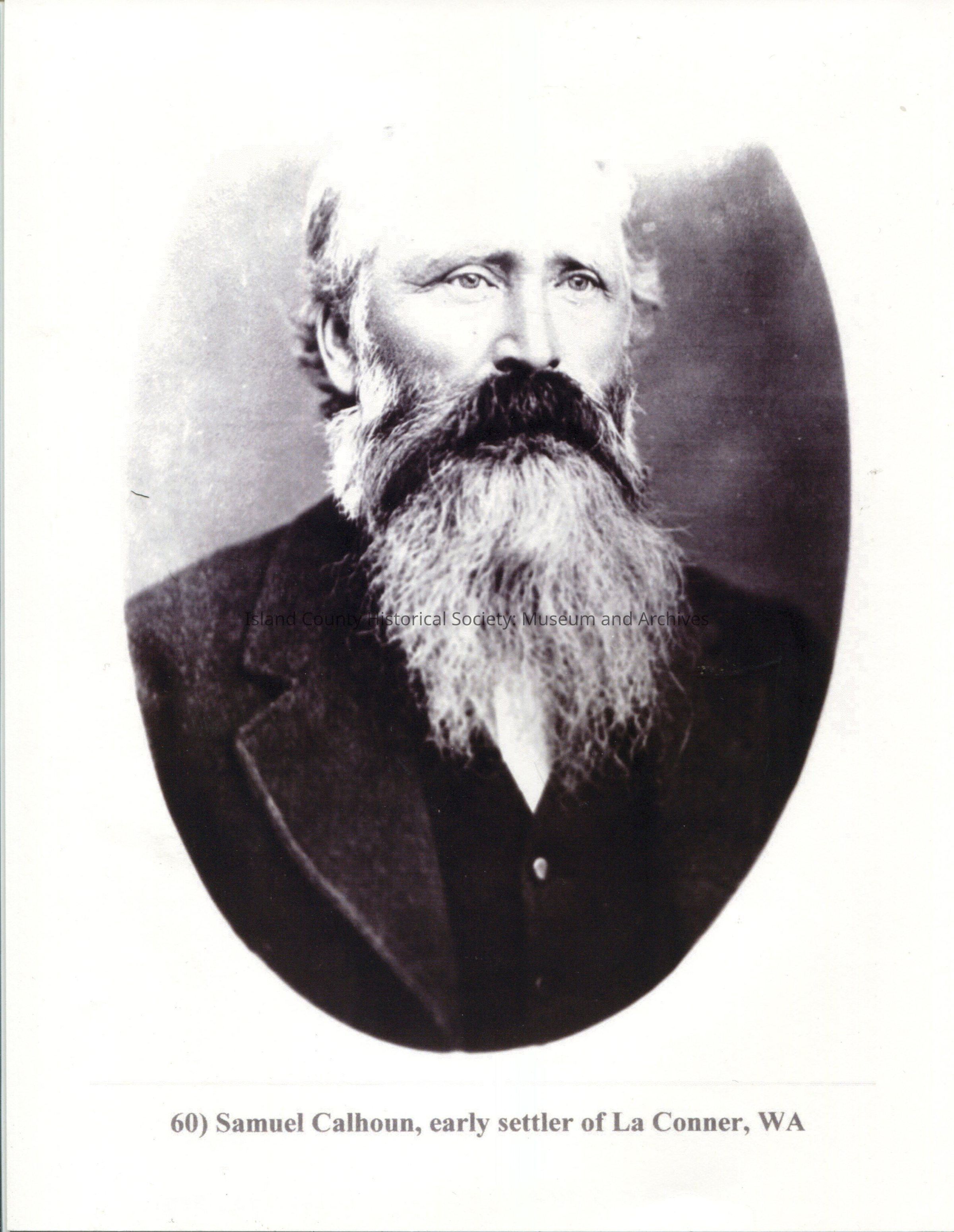 A photo of a man. Typed on the front is "60) Samuel Calhoun, early settler of La Conner, WA."