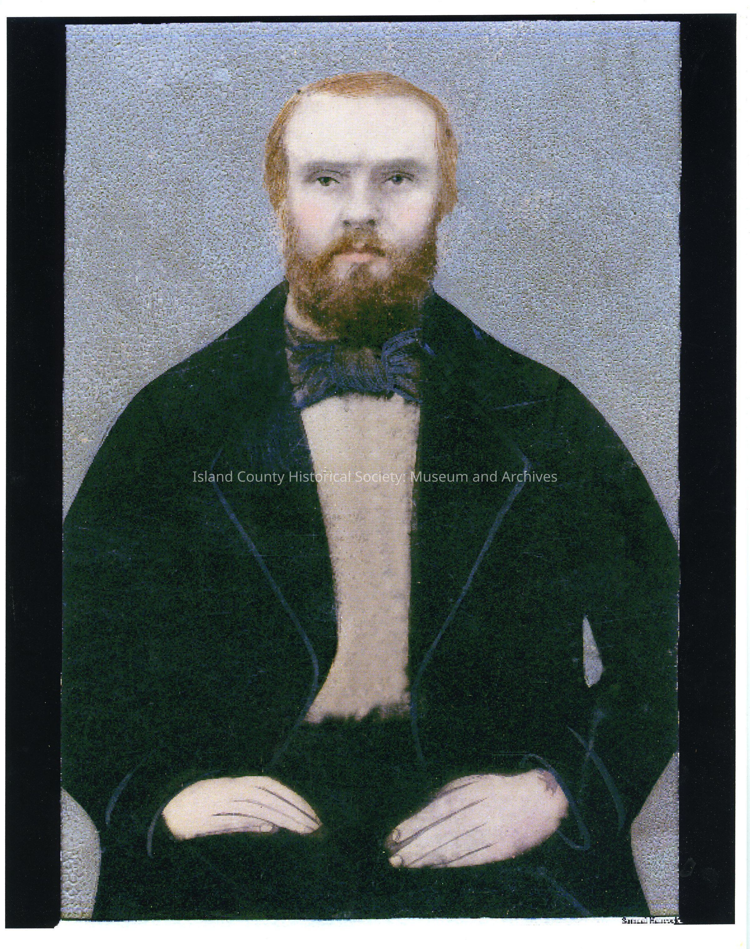 From 2013.194.106 (same photo) Copy of a tin type, portrait of Samuel Hancock. He is wearing a suit jacket and large bowtie. Portrait is a copy of a painting. Reprint of a TinType photo.