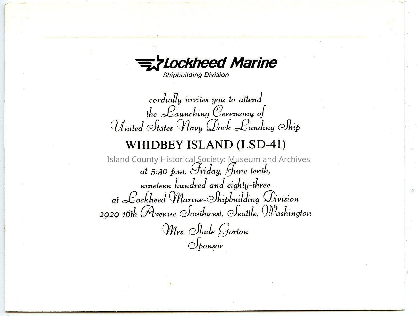 Invitation from Lockheed Marine to attend launching ceremony of United States Navy Dock Landing Ship Whidbey Island (LSD-41) on June 10, 1983 in Seattle.