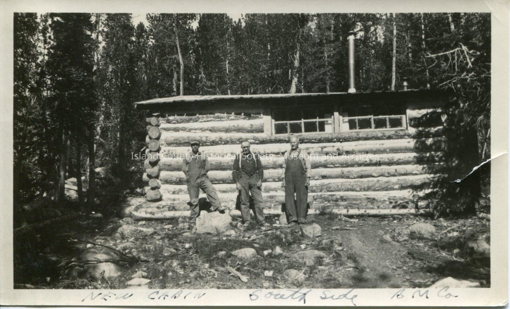 A photo of several men outside a log home. Handwritten on back is "Members of Calhoun Family at their cabin in Montana. Handwritten on front is "New Cabin, Southside. BM Co." From the accession book: Bell Mining Company cabin