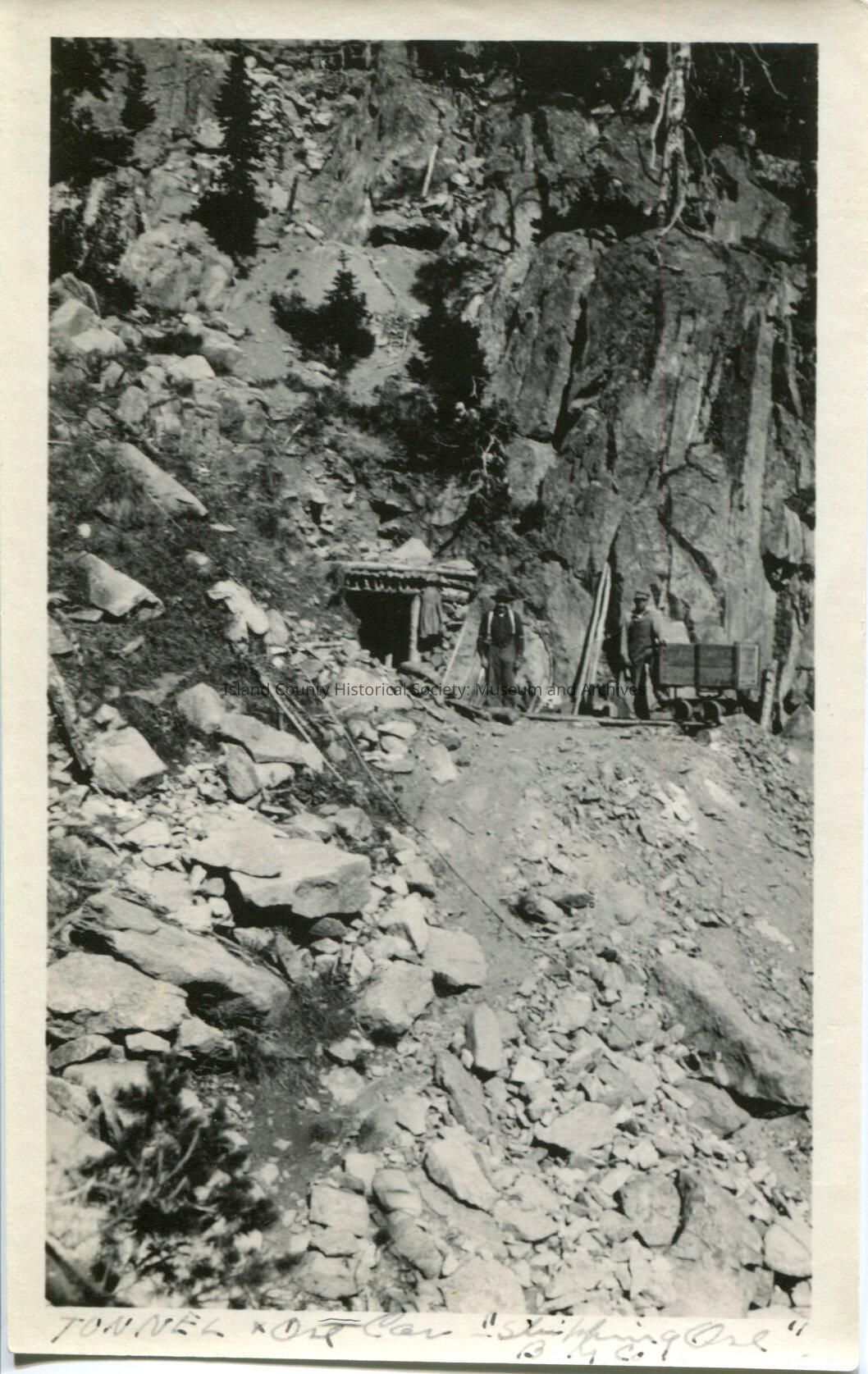 A photo of tunnel in a montain. On the front: Tunnel One car "Suffering Ore" (??) BMC (Bell Mining Company). Handwritten on the back is " Bell Mining Co Montana."