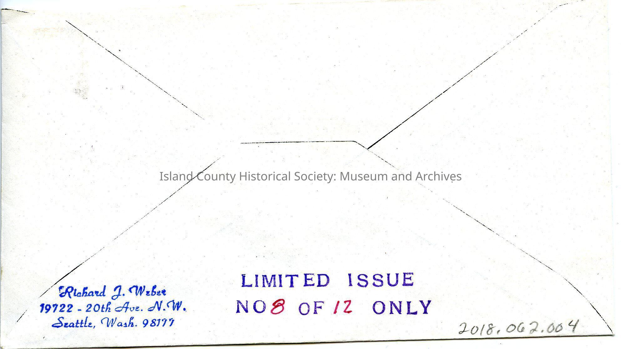 Envelope stamped from Naval Air Station Whidbey Island, Wash. Established 15, August 1942 Postmarked Oak Harbor, WA, Whidey Island Naval Air Sta. Br. USPO, Aug 15, 1982 On the back: Limited Issue No 8 of 12 only