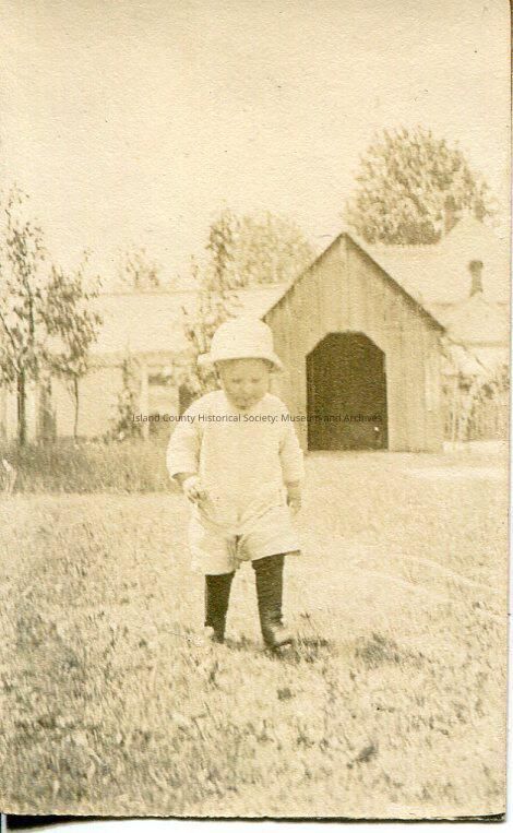 An photograph of a toddler wearing a hat, walking in the grass with an open shed in the background. Probably the same toddler as in photographs: 2015.074.783. Same toddler in 2015.074.784-.787.
