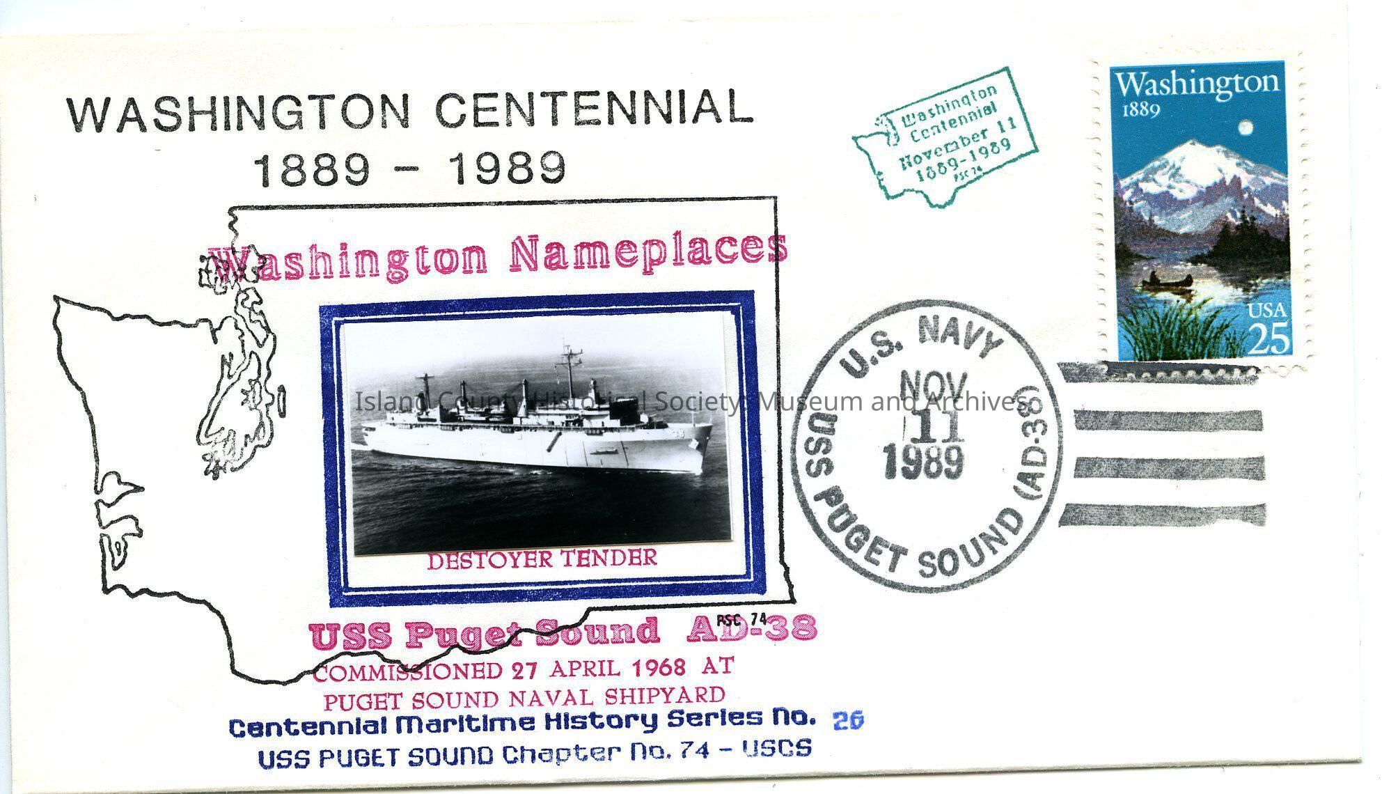 Envelope from Commanding Officer USS Puget Sound AD-38. Postmarked U.S. Navy USS Puget Sound AD-38), Nov 11, 1989. Centennial Maritime History Series No. 26