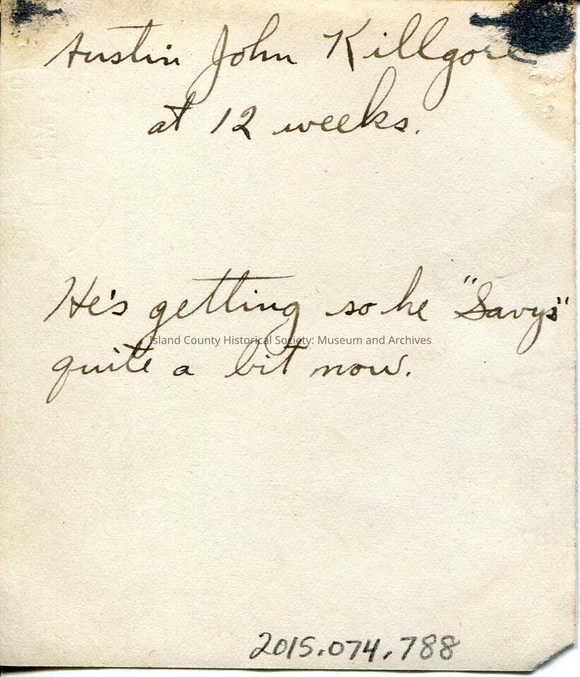 An photograph of a baby with a woolen blanket. The print section is a circle. On the bottom: Austin Killgore "Good Morning 3 mo." One the back: "Austin John Killgore at 12 weeks. He's getting so he "Savys" quite a bit now.