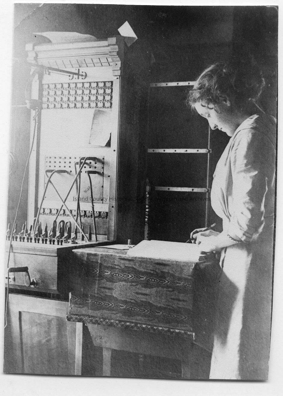 Black and white photo of a woman standing beside a telephone exchange system. She is writing in a book or ledger. From the book: Screwball Things I Remember by Laurin Willis Power. Caption reads: Oak Harbor's First Telehone Exchange. Arrow pointing to the woman: Pauline Byrne (First Switchboard Operator). Photo No. 41, Page 45. Photograph provided to author by: Paul Allen.
