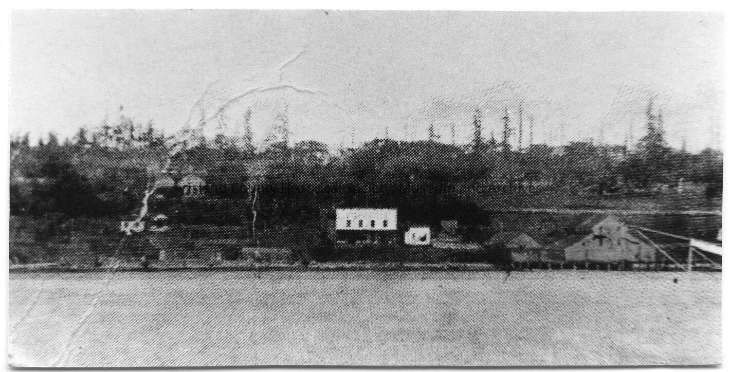 Black and white photo of view of town from the water. Trees on the hill. Buildings along the water. Pictures used in book, "Whidbey Island Memories: Screwball Things I Remember." Caption: Oak Harbor's First High School. Arrow on the lower left: Tom Martin carved canoes from cedar logs in this buillding. Arrow on lower right: J. P. Byrne Store. Arrow on right side: Oak Harbor's first High School - in the upper floor of this building. Photo No. 58, Page 56. Photograph provided to author by: Pete Fakkema.
