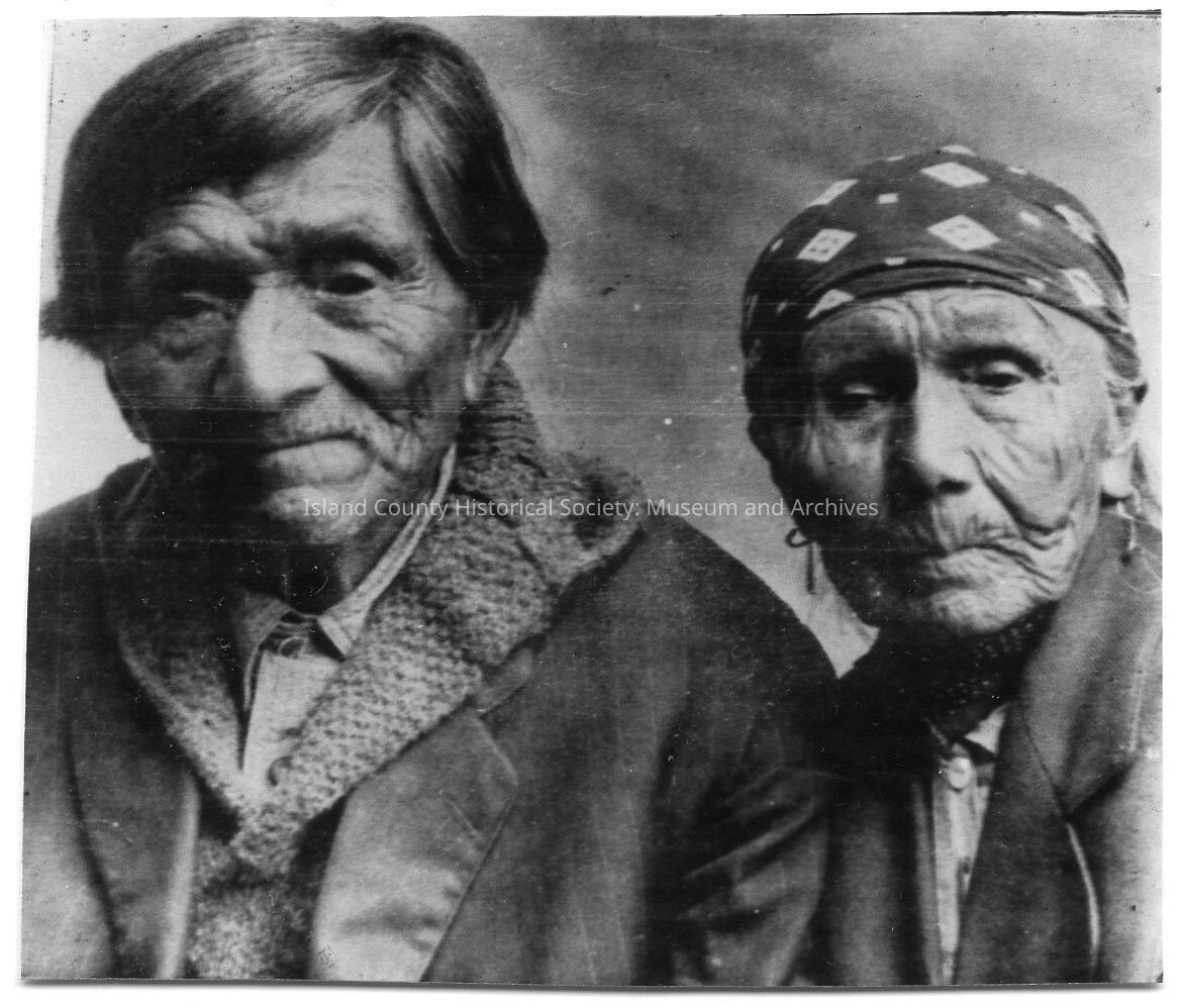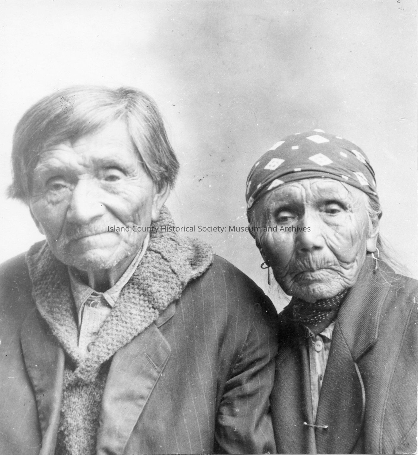 Black and white photo of Chief Snakelum and wife. Pictures used in book, "Whidbey Island Memories: Screwball Things I Remember." Caption: Chief Snakelum and wife (formerly Mrs. Katie Barlow). Photo No. 68, Page 76. Photograph provided to author by: Anna Nunan.