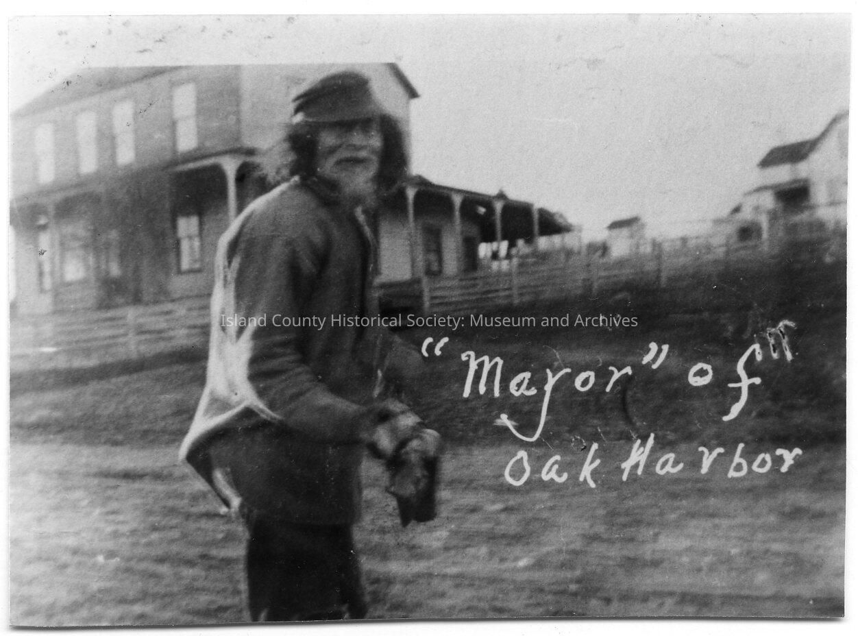 Black and white photo of bearded Native American man in a town, in the dirt road, wearing a hat. Building in the background. On the right side is written: "Mayor" of Oak Harbor.
