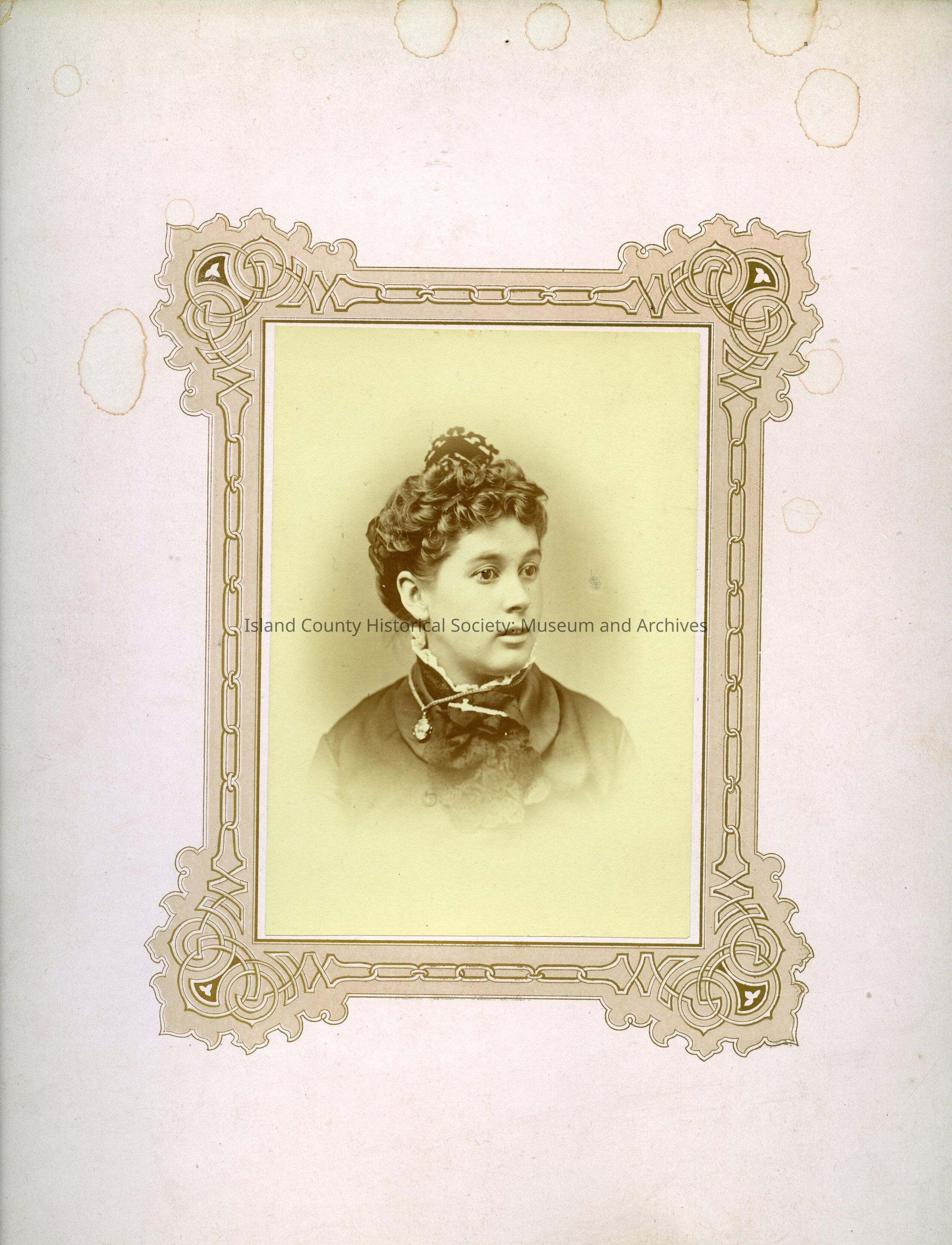 A portrait photograph of a woman. She has her hair curled and pinned up with a small hair piece. She is wearing a dark-colored blouse, collar and scarf. She is also wearing a necklace. She is posed--looking to her left. There is a border around the photo.
