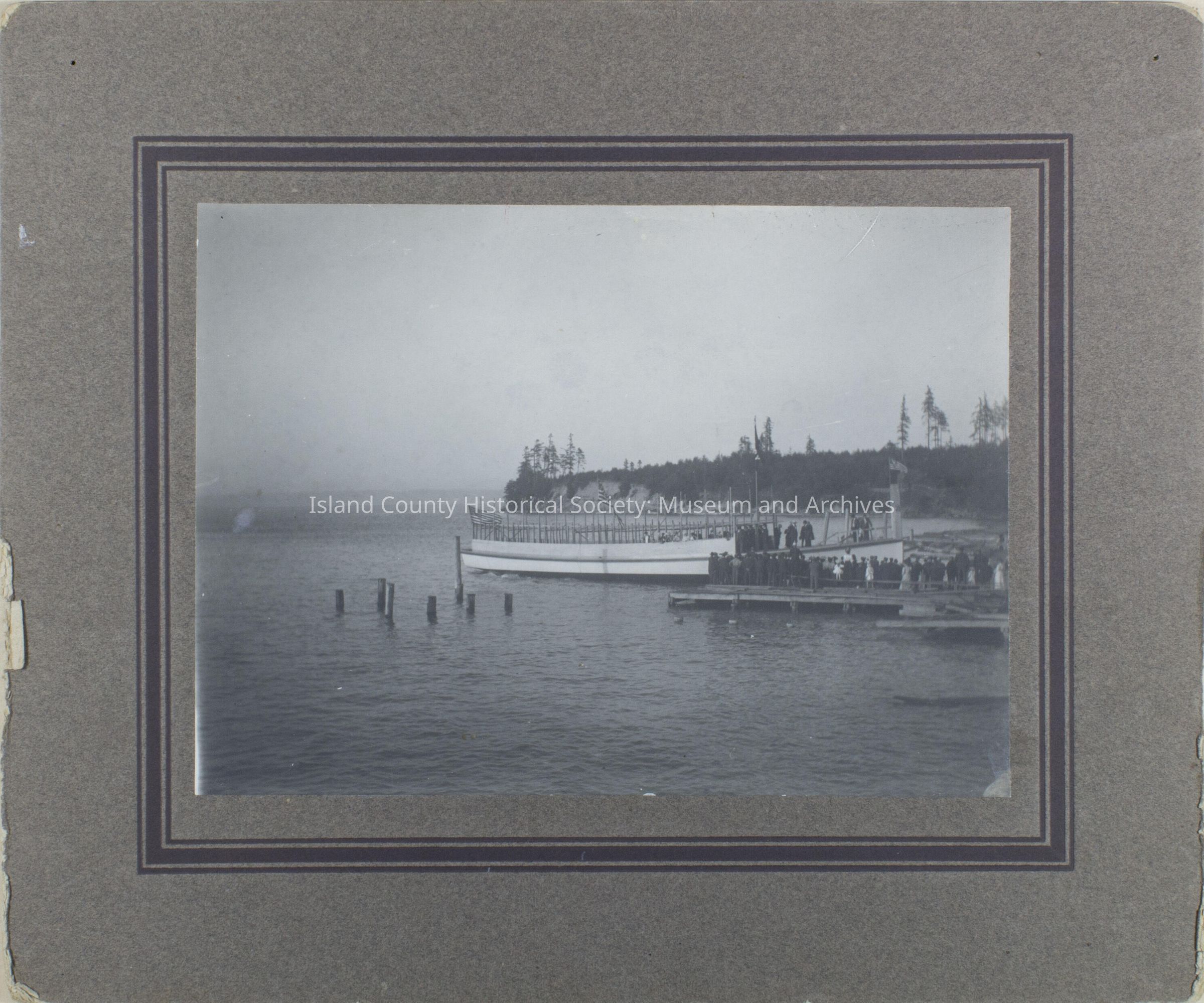 A photo with a brown mat of the launching of the S.S. Whidbey. There are about 60 people in the photo, the majority are on the dock and the rest are on the boat. There are three American flags in the picture. The back of the photo says, "Wed. May 29, 1927. Launching of Str. Whidbey built by Lovejoy brothers. Property of Mary Parker". "19" on the back.