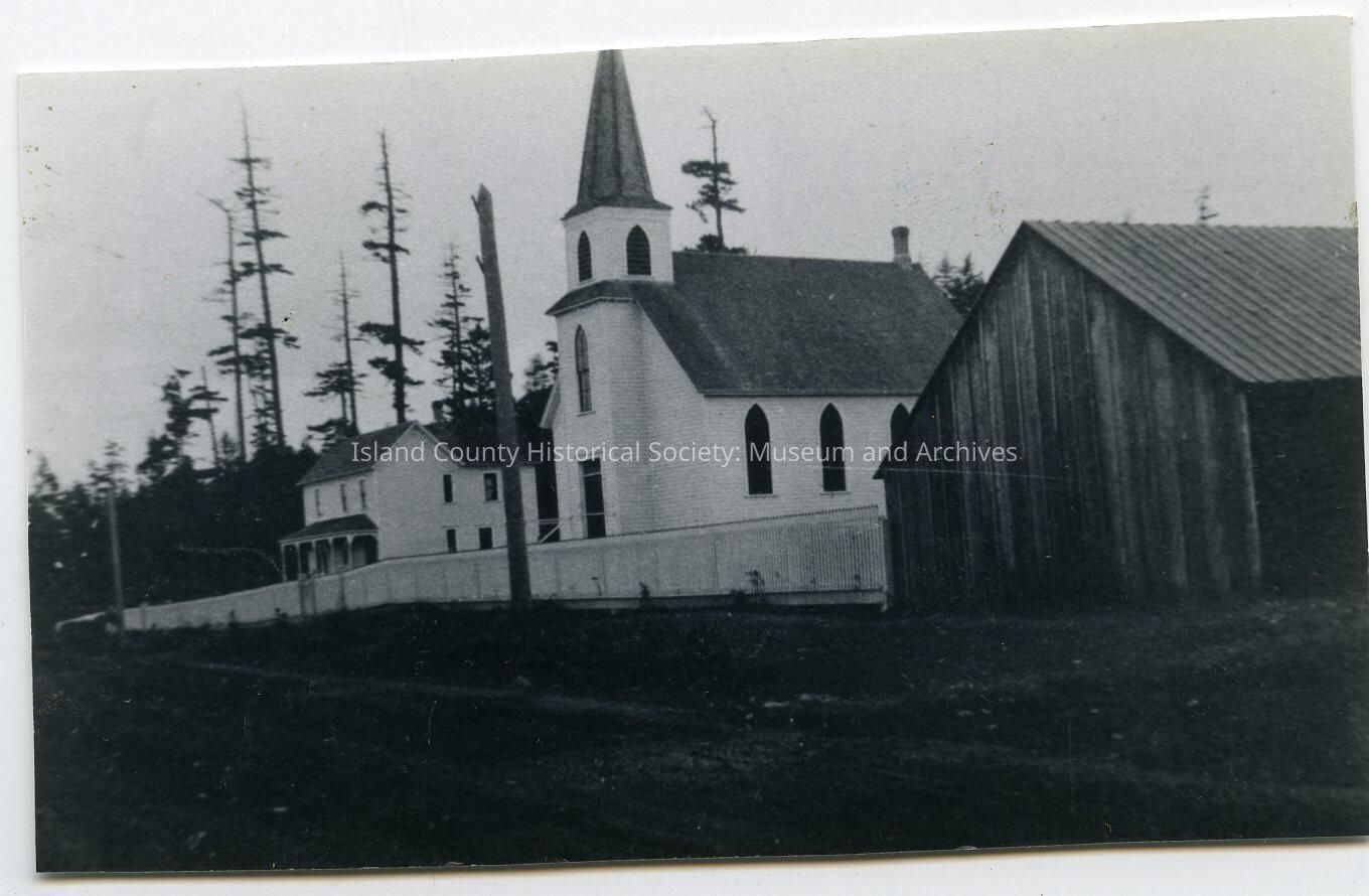 Black and white photo of house, church and barn on a dirt road; picket fence. Telephone pole. Pictures used in book, "Whidbey Island Memories: Screwball Things I Remember." Caption: Christian Reform Church. Arrow on left pointing: Horse Barn. Photo No. 74, Page 81. Photograph provided to author by: Komen.Lexicon