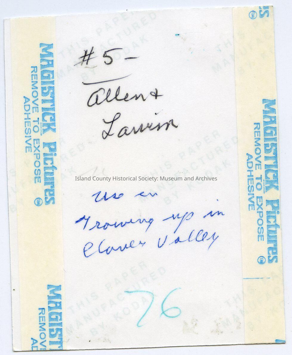 Black and white photo of two children. Boy in sailor suit with long curly hair is standing beside a cane stroller with a toddler in a lacy dress. Two places where photo has been damaged. On the back: "#5 - Allen and Laurin. Use in growing up in Clover Valley." Pictures used in book, "Whidbey Island Memories: Screwball Things I Remember." Caption: The Authors. Standing: Edward Allen Power. Seated: Laurin Willis Power. Photo No. 76, Page 40, part 2. Photograph provided to author by: (not provided).Lexicon
