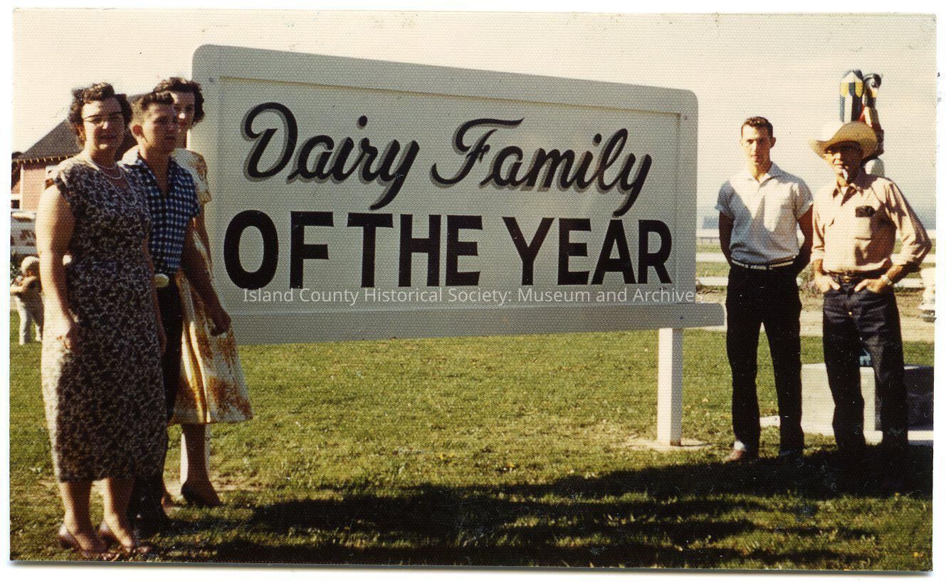 Color photo of five adults standing oneither side of a large rectangular sign: Dairy Family of the Year. Man on right wearing a hat. Pictures used in book, "Whidbey Island Memories: Screwball Things I Remember." Caption: Washington State Dairy Family of the Year - 1958. l. to. r. Vera Power, Jack Power, Myrna Power, Ronald Power, Laurin Power. Photo No. 77, Page 40, part 2. Photograph provided to author by: (not provided).Lexicon
