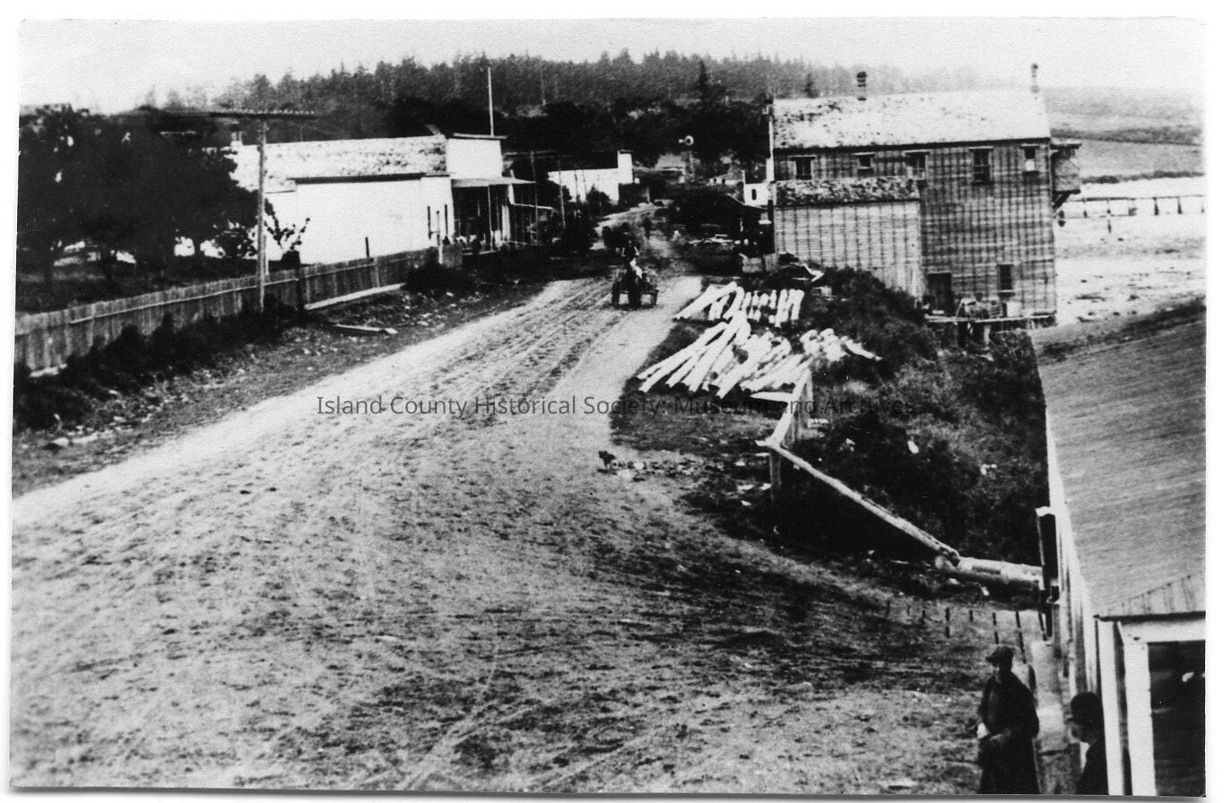 Black and white photo dirt road, logs, horse and car, wharf, buildings. Photo is not in the book. Other pictures used in book, "Whidbey Island Memories: Screwball Things I Remember."Lexicon