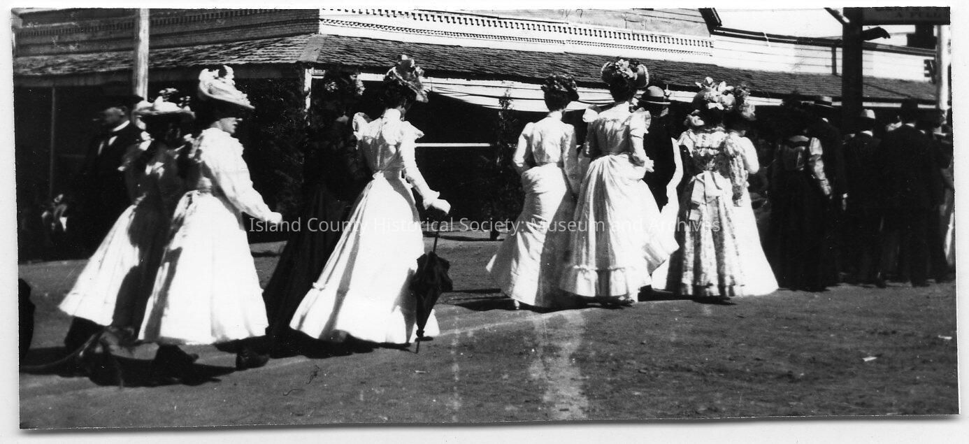 Black and white photo of a group of women in dresses, hats with flowers and bows, a parasol, walking together probably in a town. Pictures used in book, "Whidbey Island Memories: Screwball Things I Remember." Caption: A group of turn-of-the-Century ladies out for a stroll. Photo No. 46, Page 46. Photograph provided to author by: Yorke Dyer.Lexicon