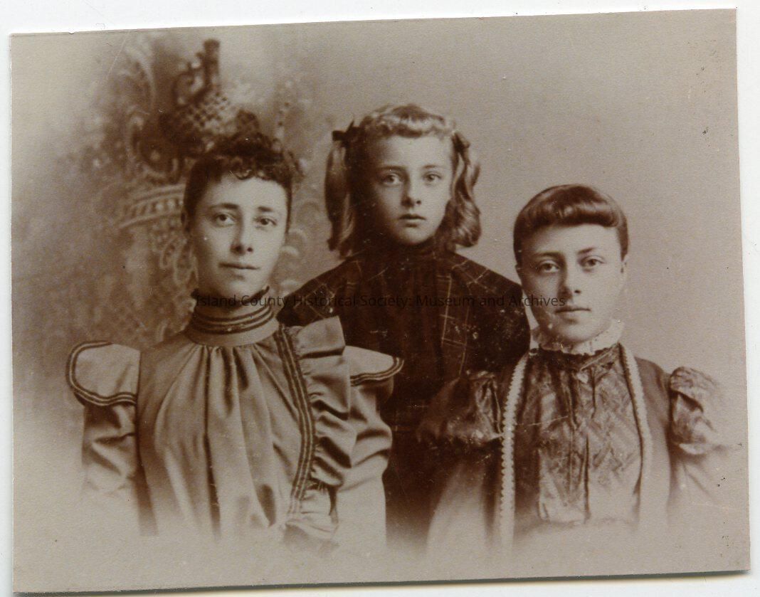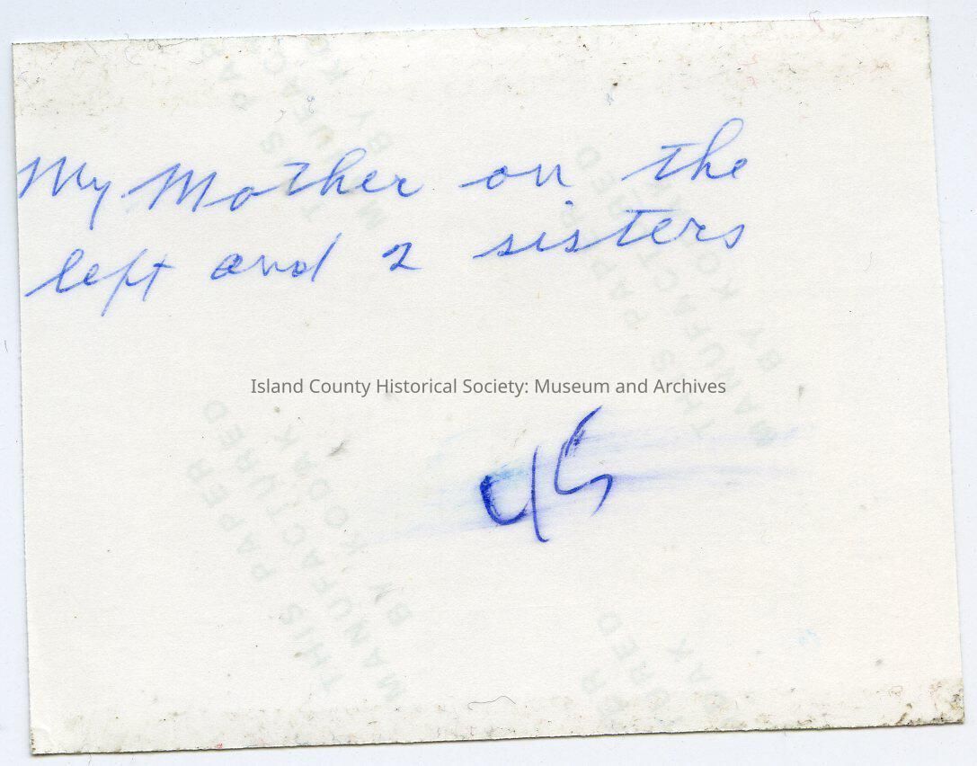 Black and white photo of a three young women wearing dresses with ruffles. On the back: "my mother on the left and two sisters." Pictures used in book, "Whidbey Island Memories: Screwball Things I Remember." Caption: Grace*, Ethel and Sadie James. * the author's mother. Photo No. 45, Page 46. Photograph provided to author by: Marie James.Lexicon