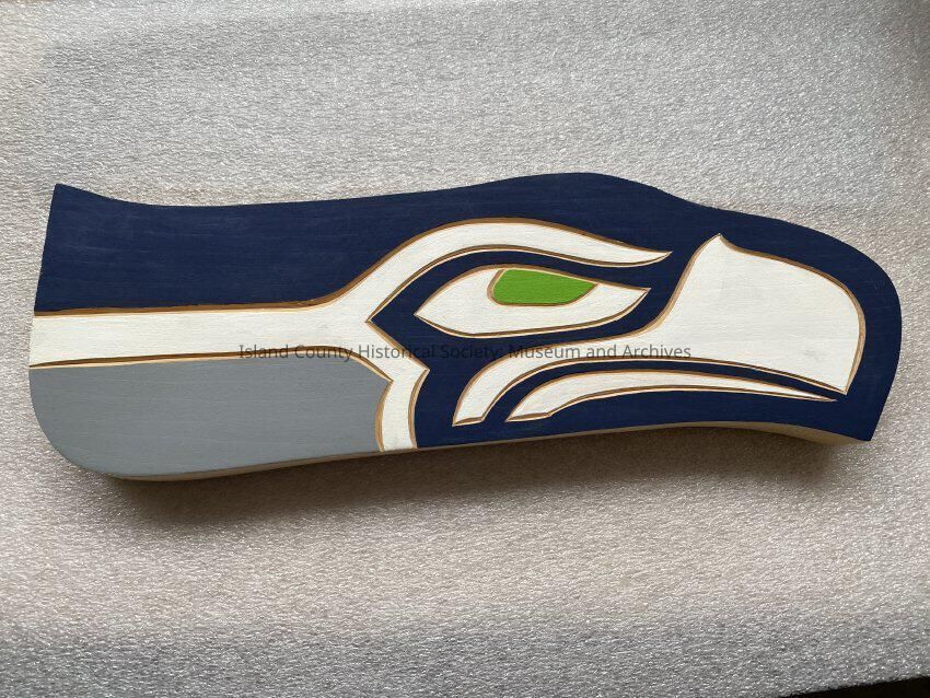 Seahawks logo carving by Swinomish master carved Kevin Paul in 2016.