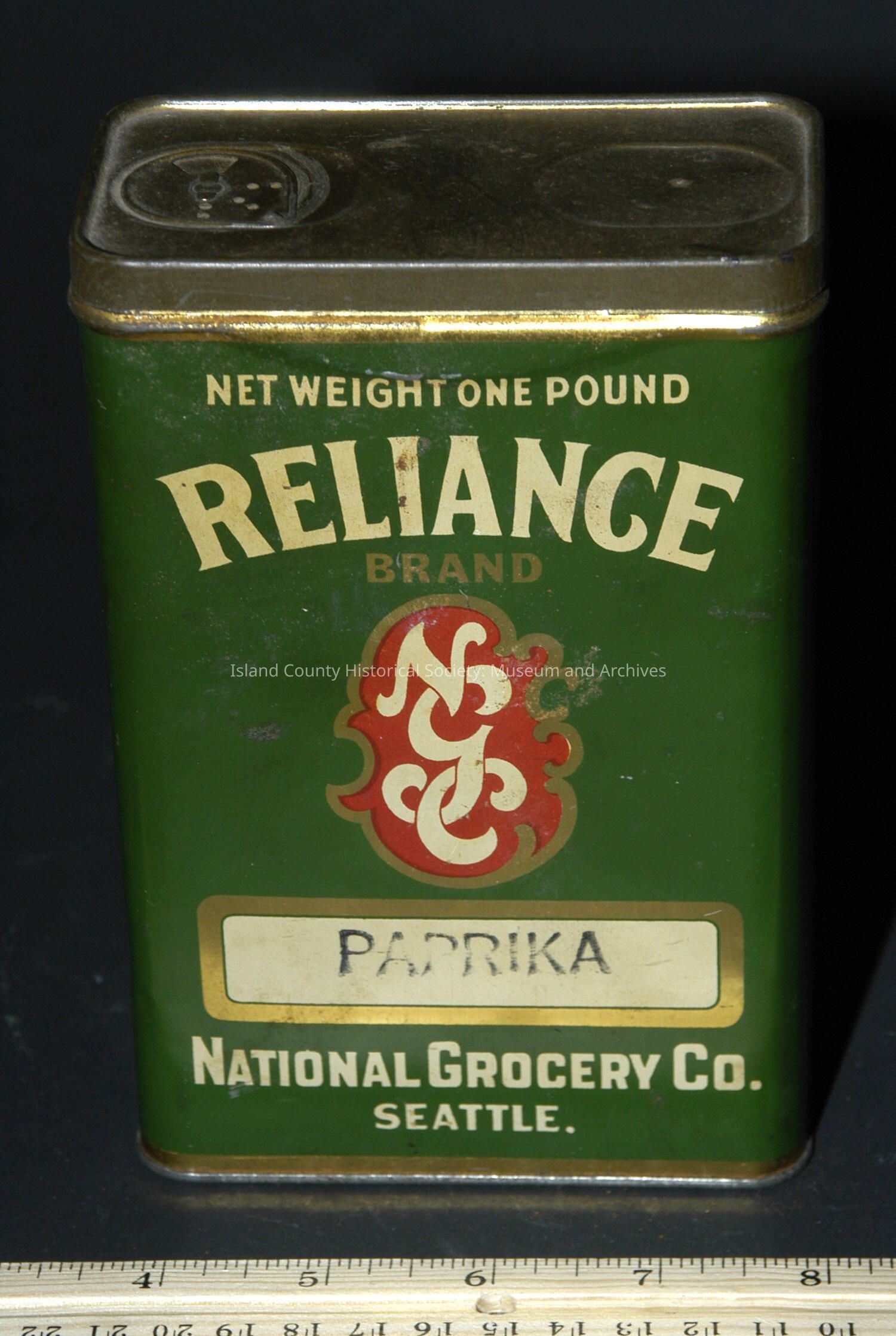 Paprika box, National Grocery Co., 1 lb tin can. Marybelle Hotel