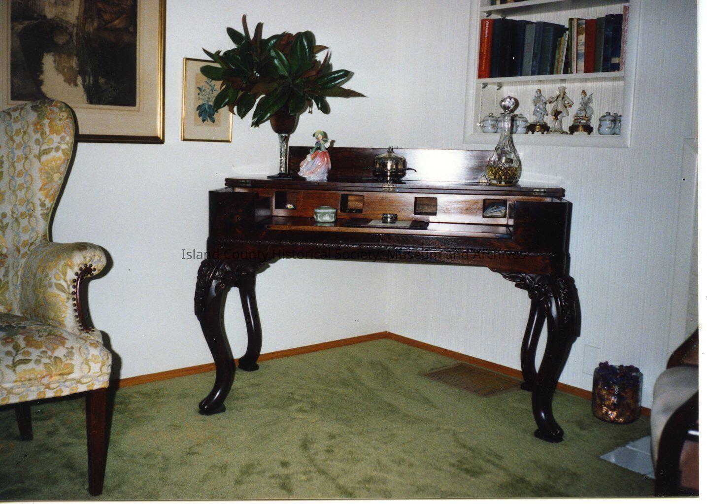 Photo of a piece of furniture, a desk, with a plant on top of it, and a chair on the left.