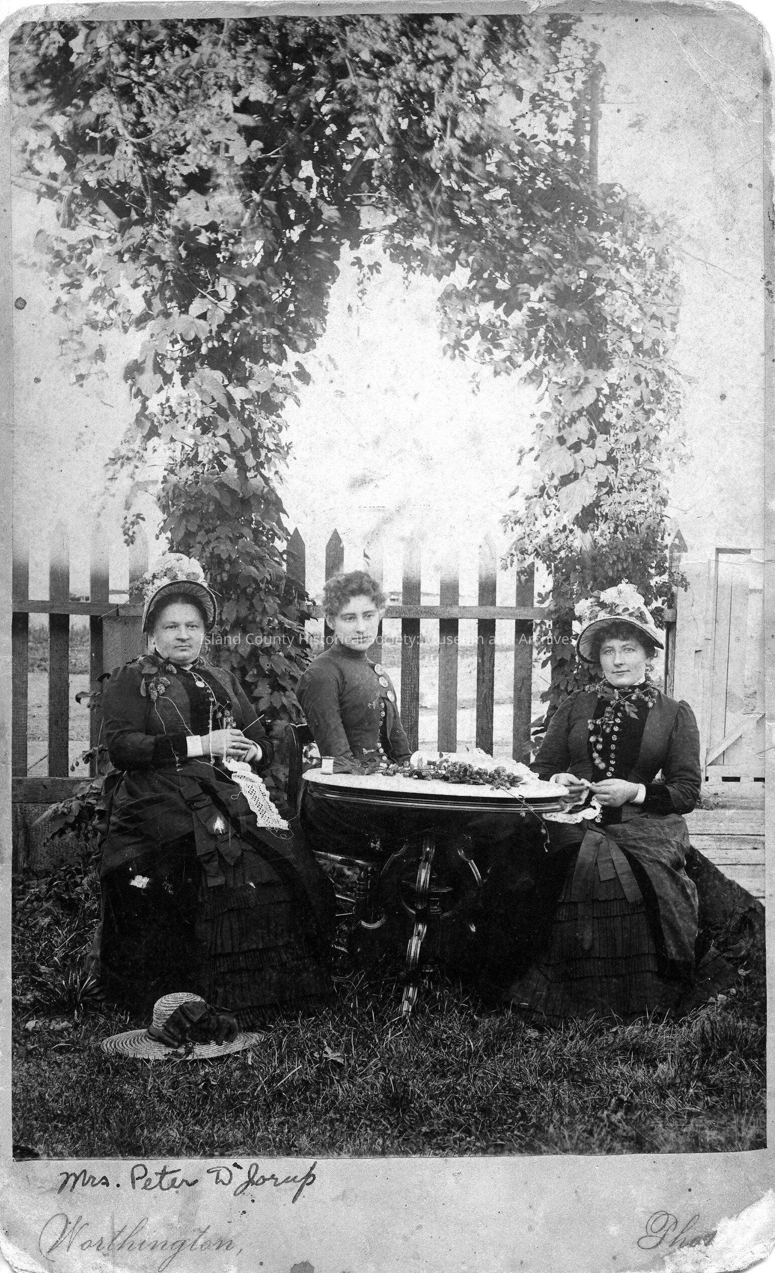 Mrs. Peter D'Jorup. Three ladies in dresses, coats, and two with hats with flowers are sitting at a table in front of a picket fence with an arbor in back. A straw hat is on the ground. The two ladies with hats are tatting lace.