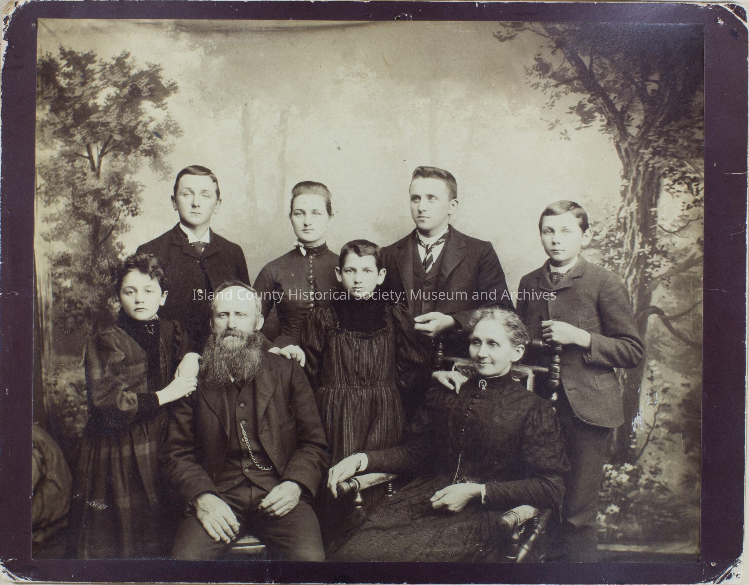 A black and white albumen photo of Calhoun Family portrait. Two adults (parents) seated, six children standing behind them. Three boys and three girls.