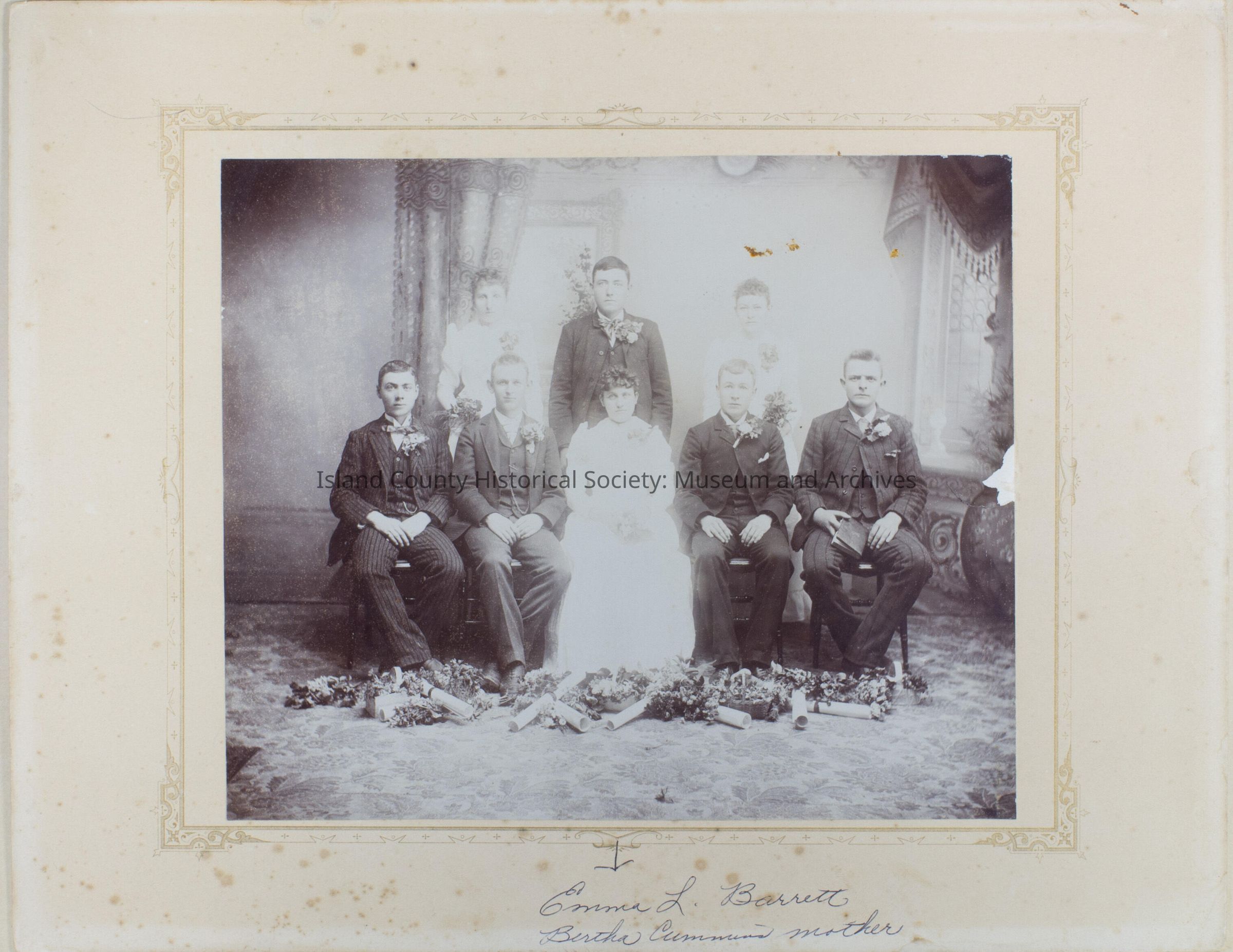 A black and white albumen photo of a group of 5 men and 3 women after graduation. They are seated or standing with their diplomas and flowers in front of them on the floor. An arrow pointing down on the bottom, plus written below it: