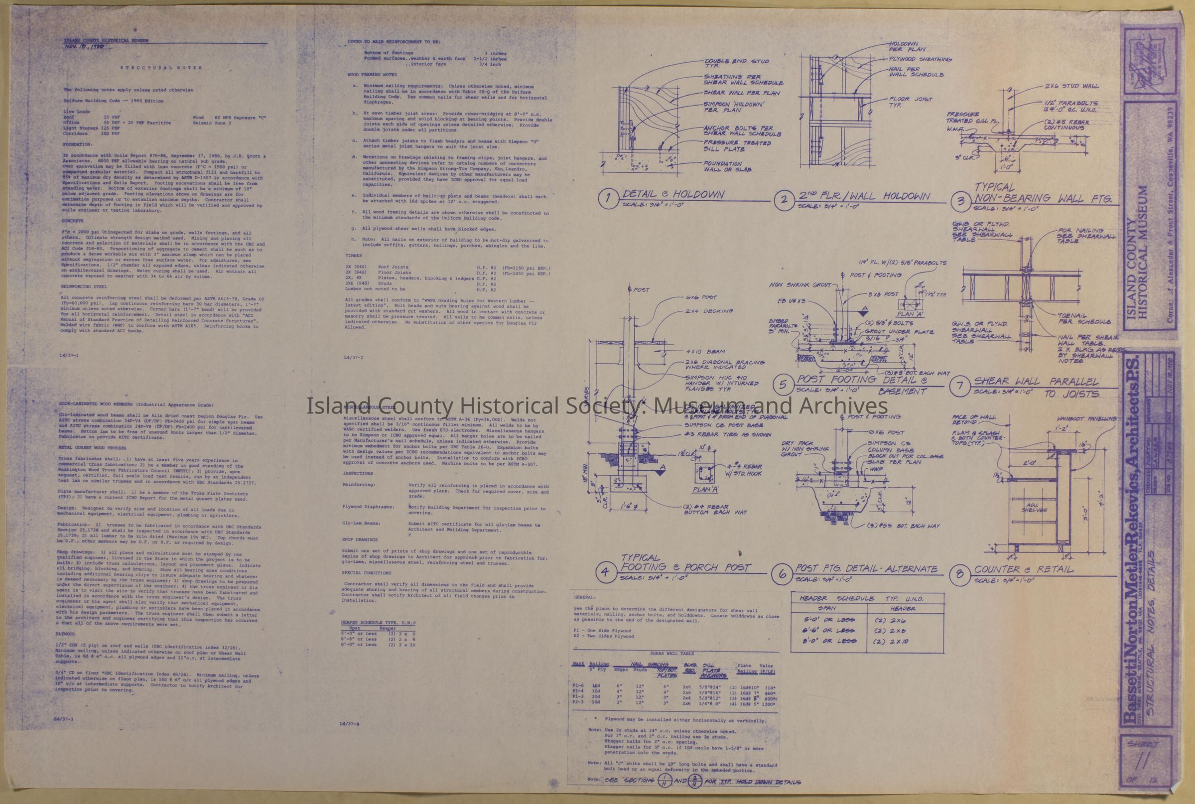 Architect Drawing of Island County Museum Building -1988; Structural Notes, Details - Sheet 11