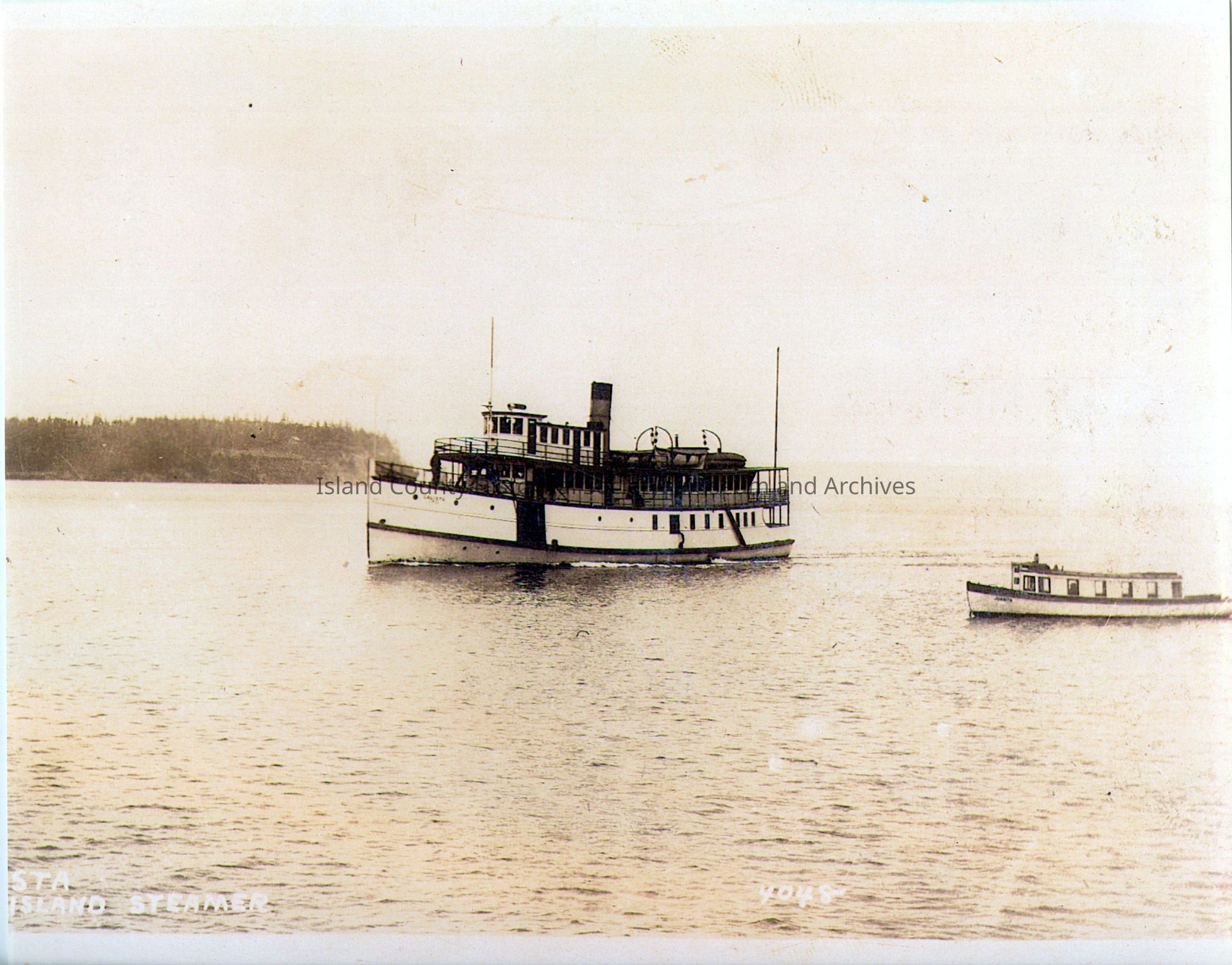 Photograph of the steamboat "Calista" (left) and the smaller boat "Juanita" (right), c. 1911-1920. Reverse of photo notes, "Credit to Howard Grasser, from the collection of Captain Henry Arnold."Collection