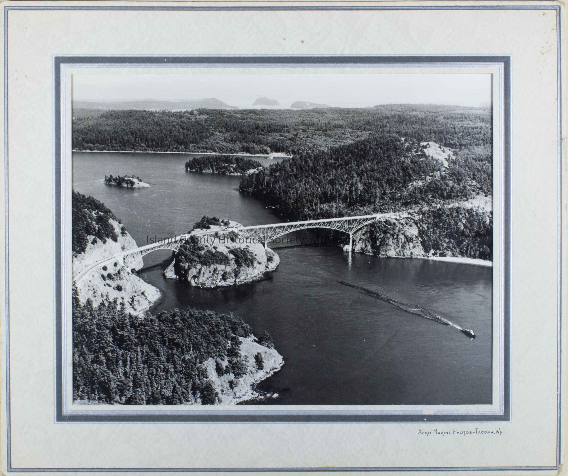 Black and white silver gelatin photo of Deception Pass and Bridges from the air above Fidalgo Island. Steamer or other boat in lower right section of photo. Cars and people are on the bridge and Pass Island.