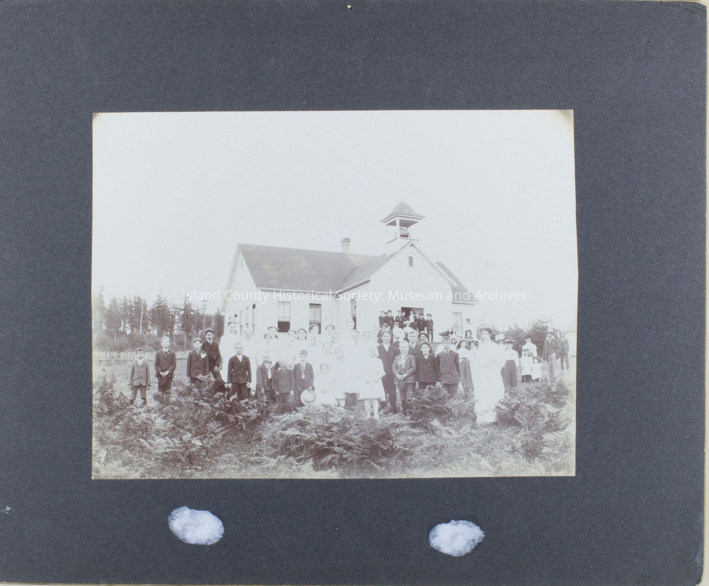Black and white photo of school, school children, parents, teachers in front and on the steps. Bell in belfry above front door. Ferns in front. Picket fence in back. On the back: "Bayview School"