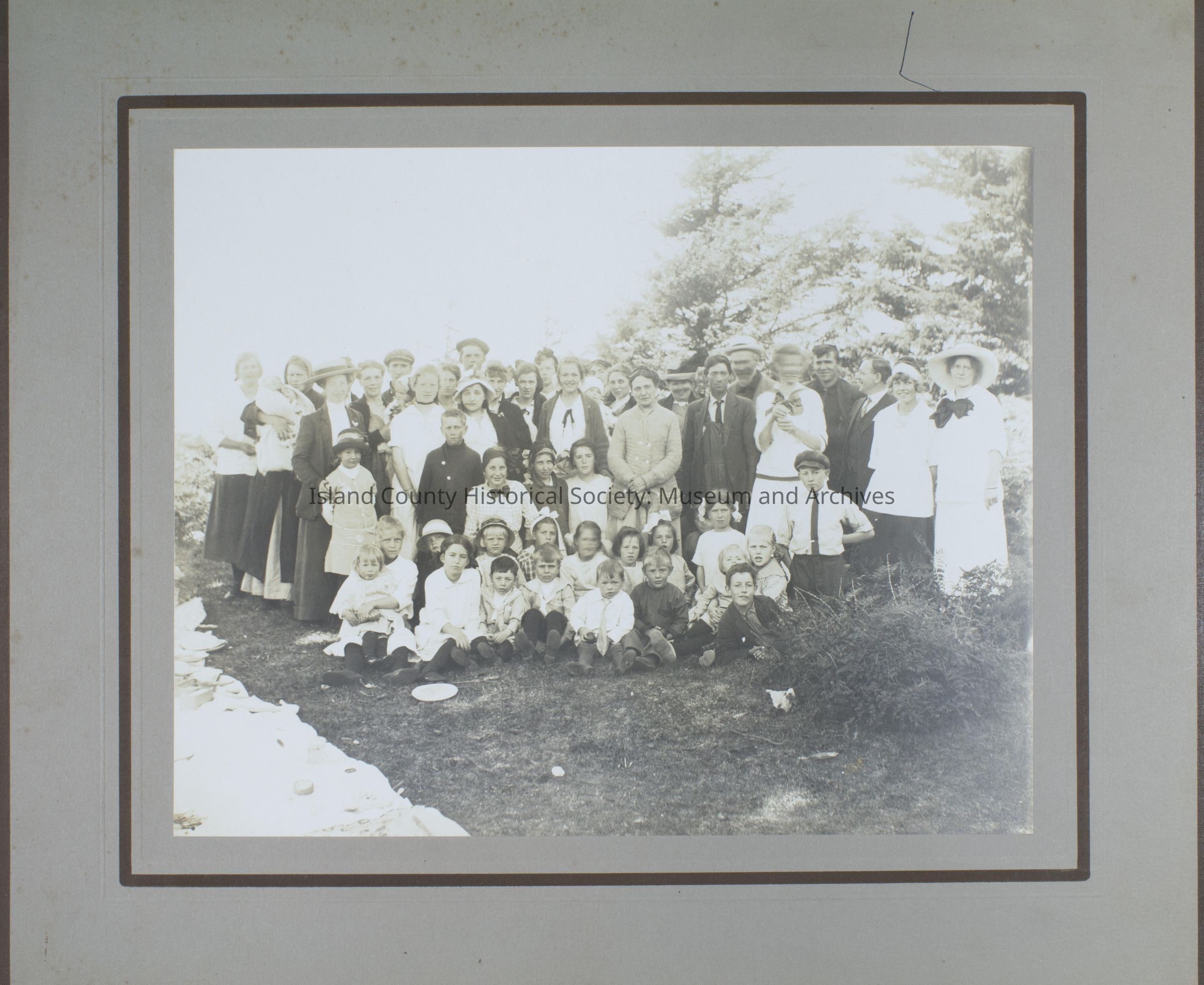 Black and white albumen photo of adults and children sitting outside, having a picnic. They are posed in rows with the smaller children in front. Some are laughing - one woman is blurred while laughing. On the back: "Methodist Church Picnic"