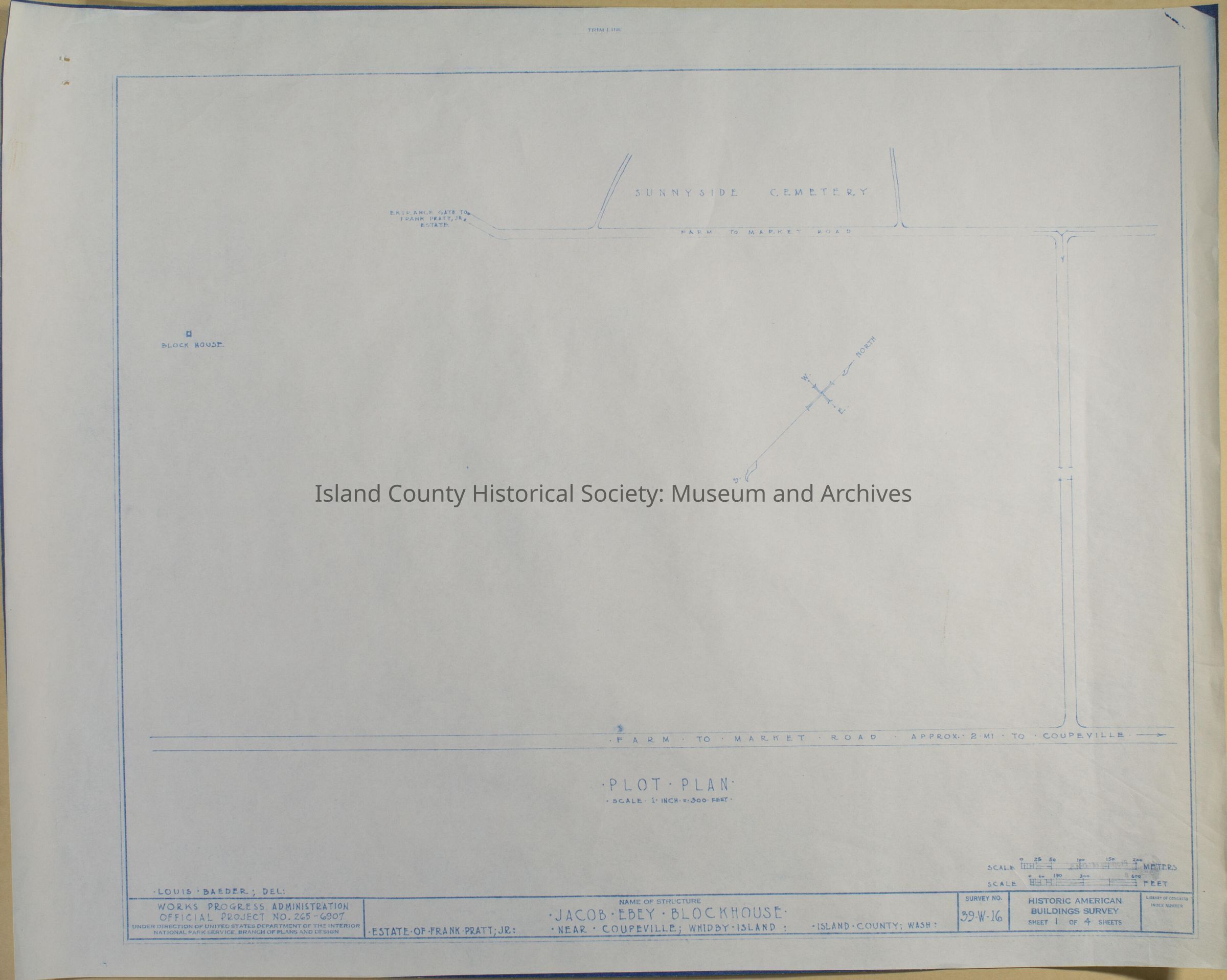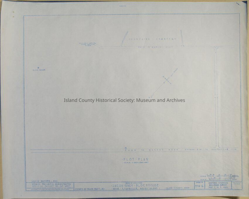 Architect Drawing of Jacob Ebey Blockhouse - Plot Plan. Survey No. 39-W-16; Sheet 1 of 4.