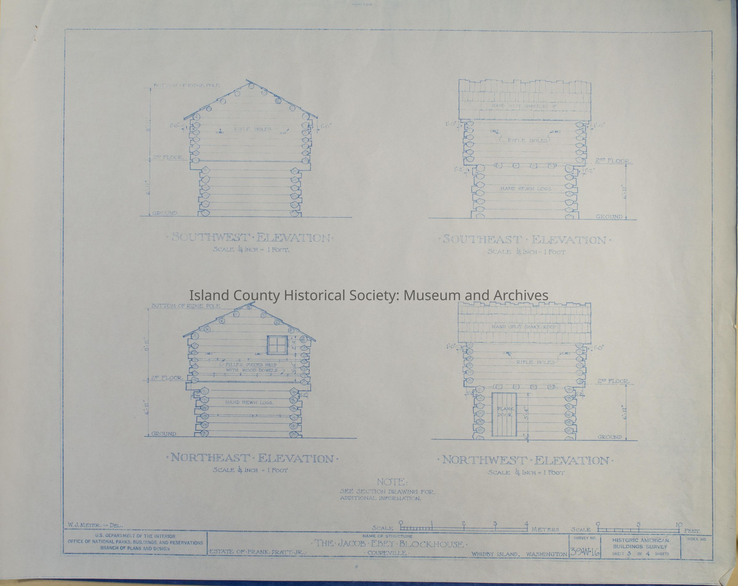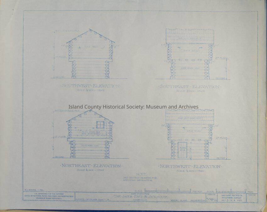 Architect Drawing of Jacob Ebey Blockhouse - External Elevation Views. Survey No. 39-W-16 - Sheet 3 of 4.