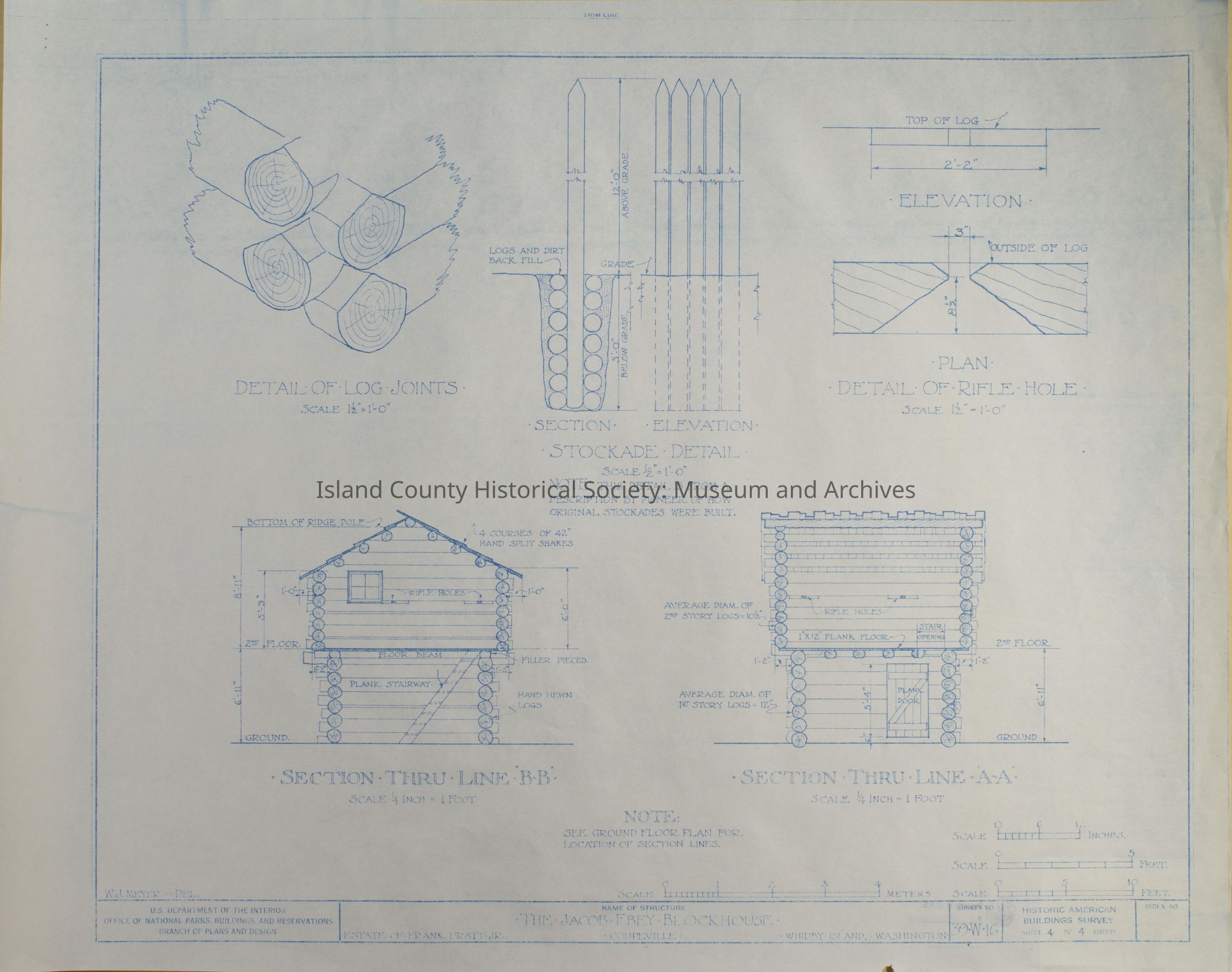 Architect Drawing of Jacob Ebey Block House - Details of external Log Joints, Rifle Holes, and Section True Lines. Survey No. 39-W-16 - Sheet 4 of 4.