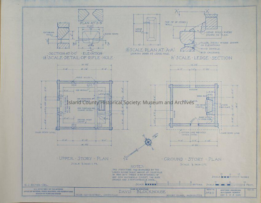 Architect Drawing of the Davis Blockhouse - Ground and Upper Floor Plans. Survey No. 39-W-11 - Sheet 2 of 4.