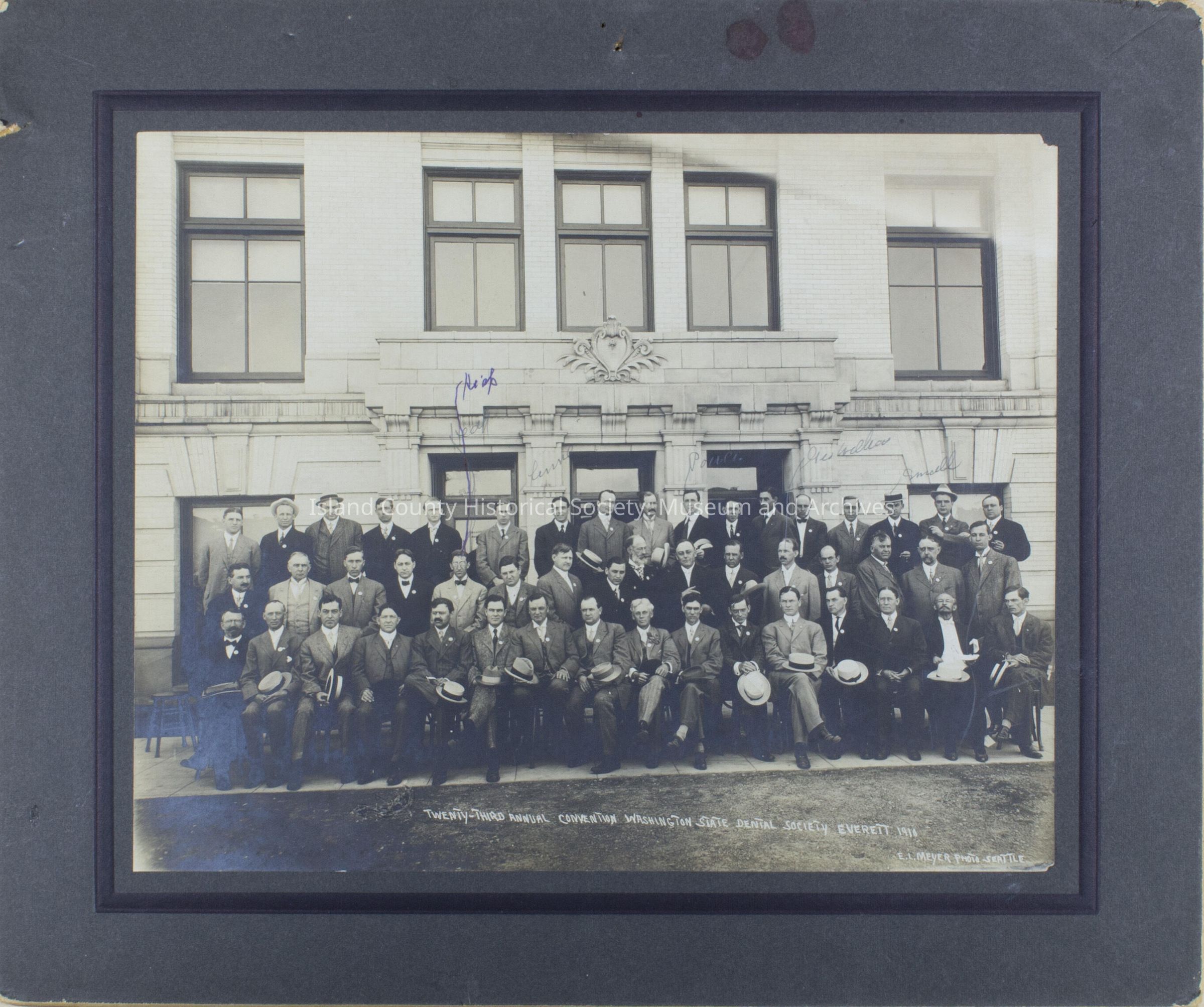 Black and white silver gelatin photo of a group of men in suits, some holding or wearing hats, seated or standing in three rows outside a brick building. In ink with lines to individuals: from left to right: Heap Heap (same man, second row, 5th from left), Lenne, Power Geo Wallace Small. On the bottom of the photo in white lettering: "Twenty-third Annual Convention Washington State Dental Society Everett 1916 E. L. Meyer Photo Seattle"Made/Created