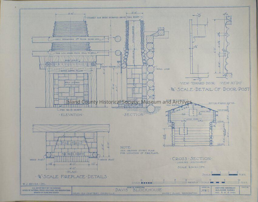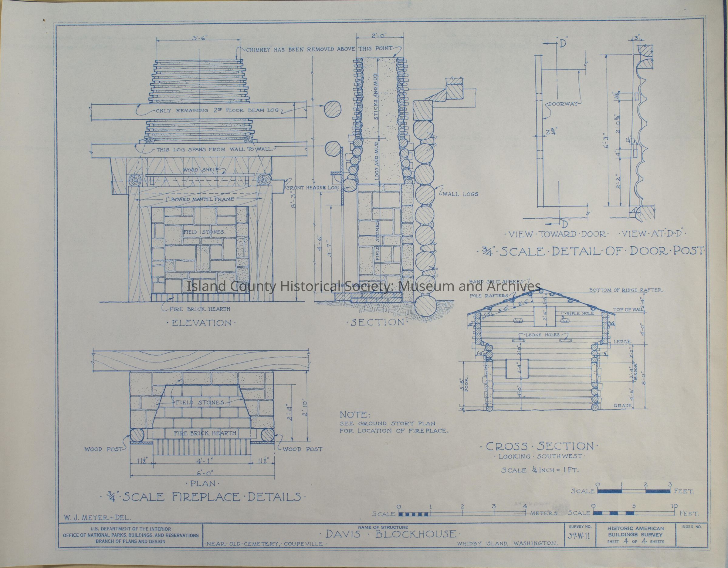 Architect Drawing of the Davis Blockhouse - Cross Section, Fireplace Details, Door Post Details. Survey No. 39-W-11 - Sheet 4 of 4.