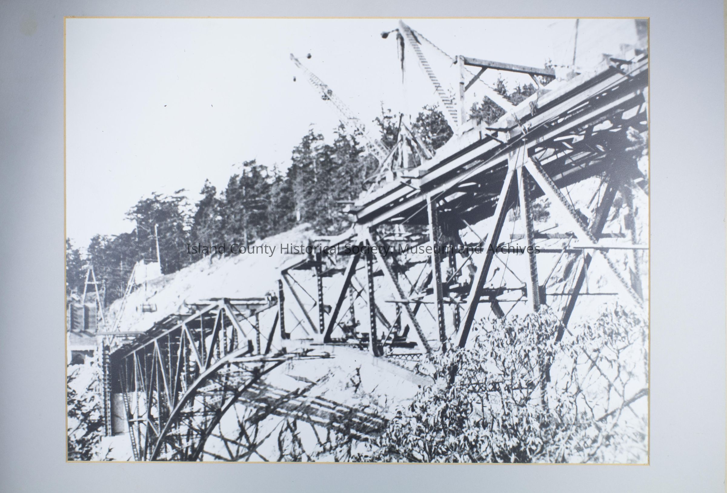 Black and white photo of Deception Pass Bridge under construction. Cranes and other equipment. Taken from below. On the back: "1935" "copy" and studio details: "The Little Gallery 1112 West Pioneer Way Oak Harbor Washington 88277 Telephone (206) 676-5138"
