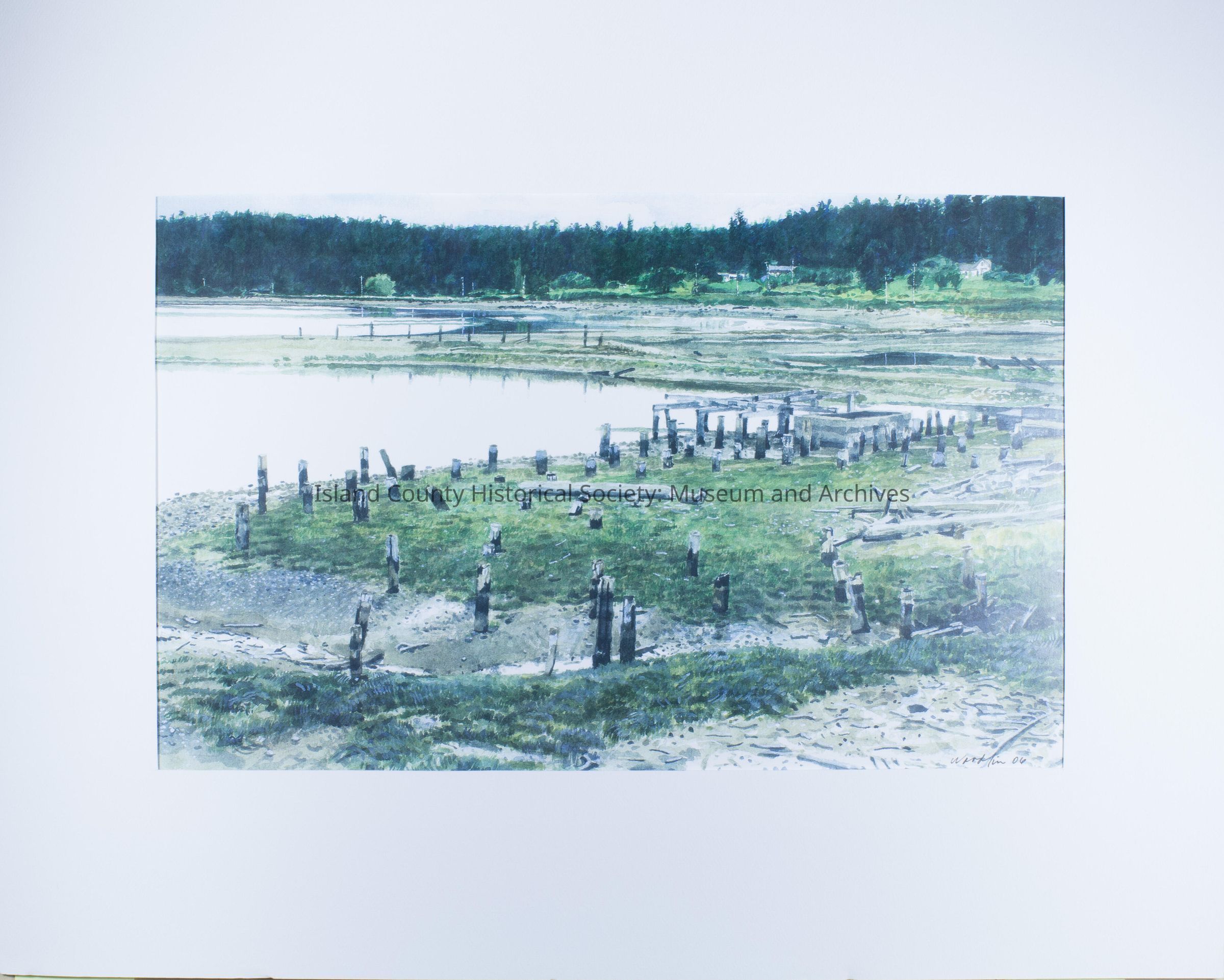 Watercolor. Details are written on paper attached to reverse. "Old Mill at the End of Penn Cove Perry Scott Woodfin" On lower right: "Woodfin 06"Lexicon