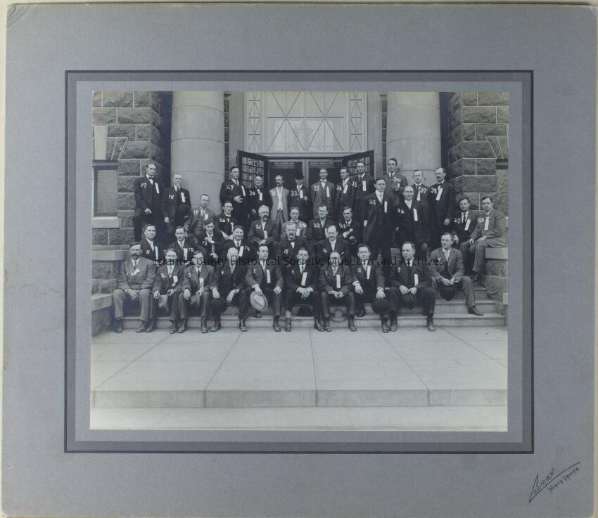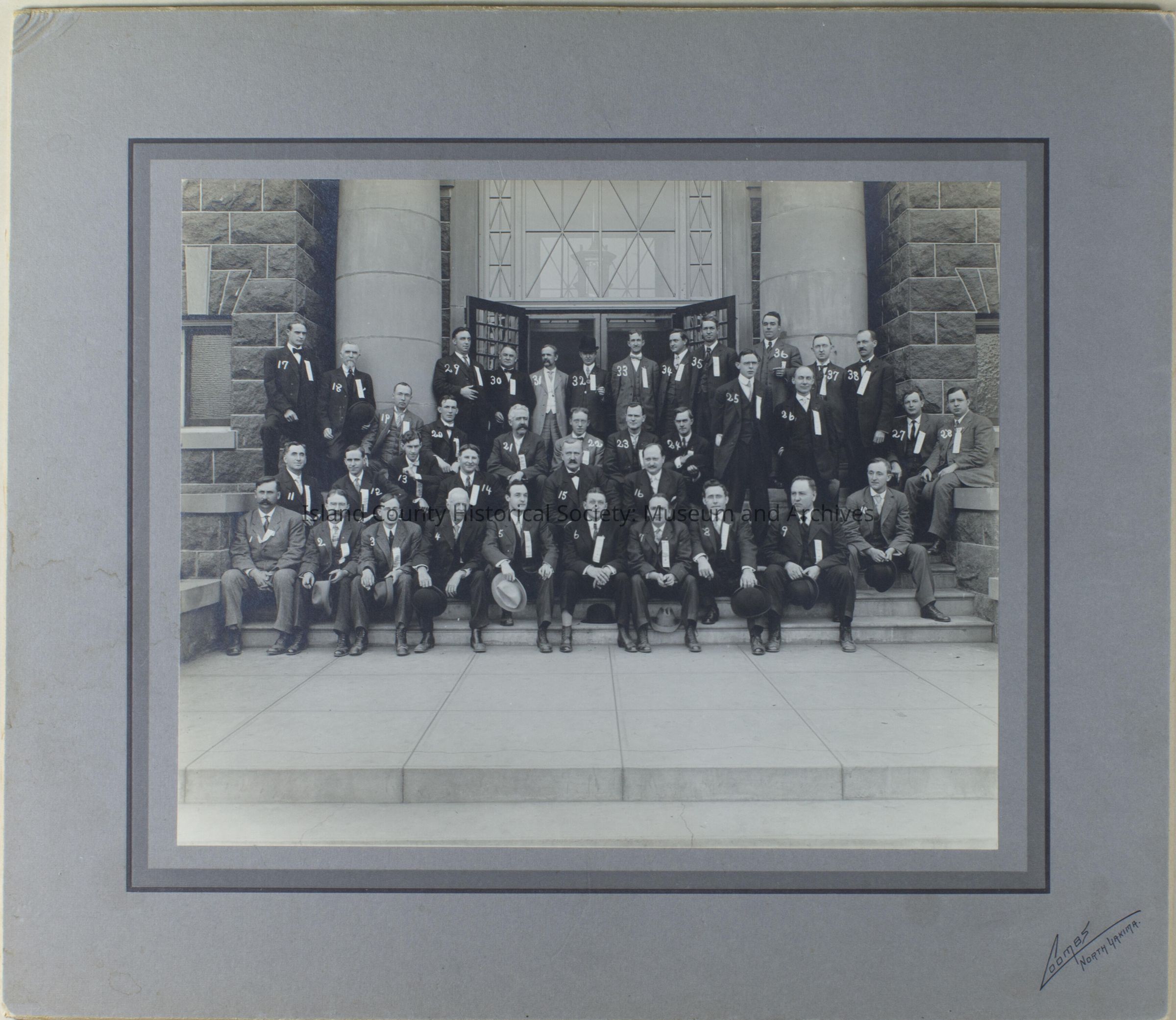 A black and white photo of men standing or sitting on stairs leading to a building. They are wearing suits and some are holding hats. Some have names tags or labels hanging off the left jacket pocket. All the men have numbers written on them in white.