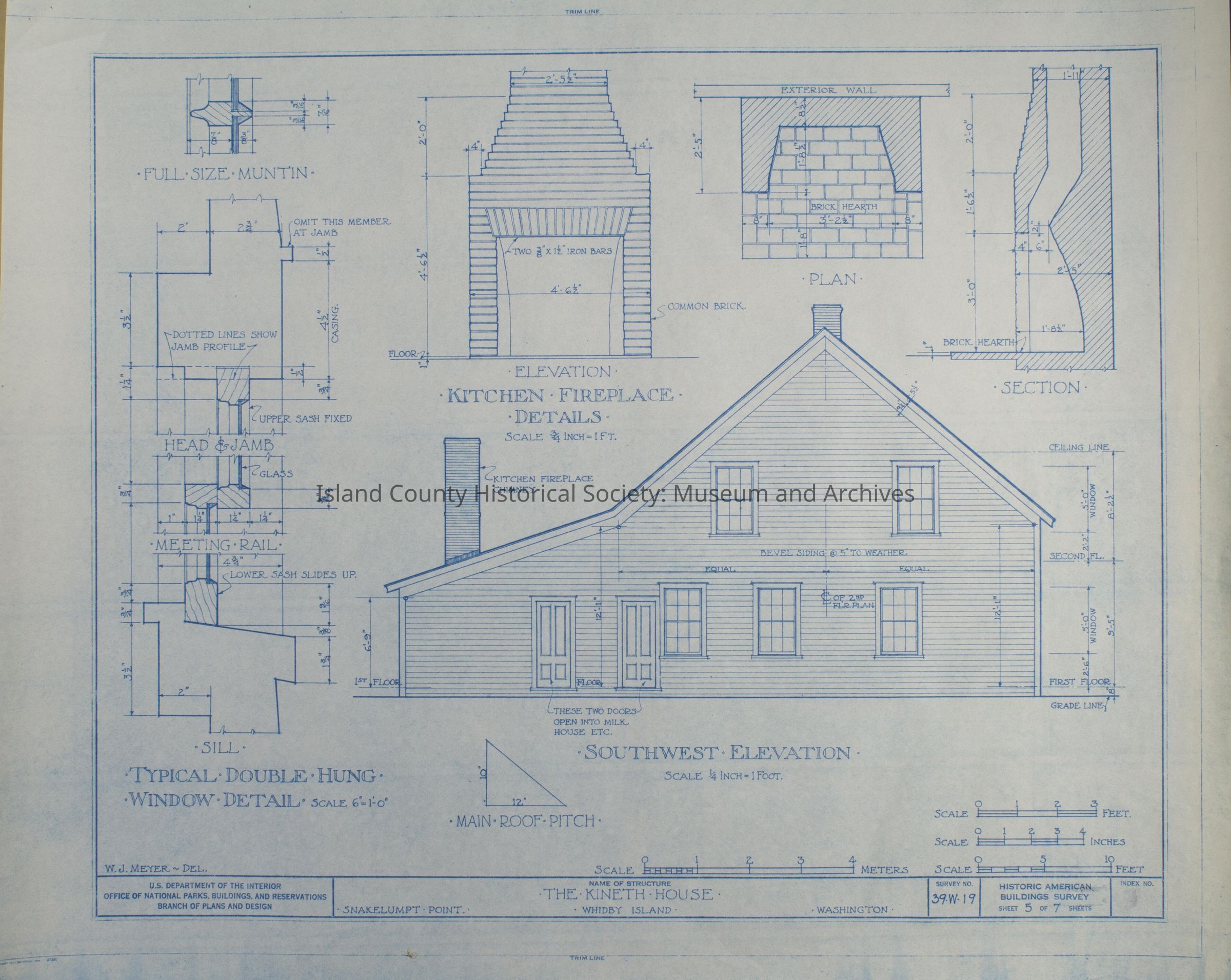 Architect Drawing of the Kineth House. Southwest Elevation, Typical Double Hung Window, Kitchen Fireplace Details. Survey No. 39-W-19 - Sheet 5 of 7.