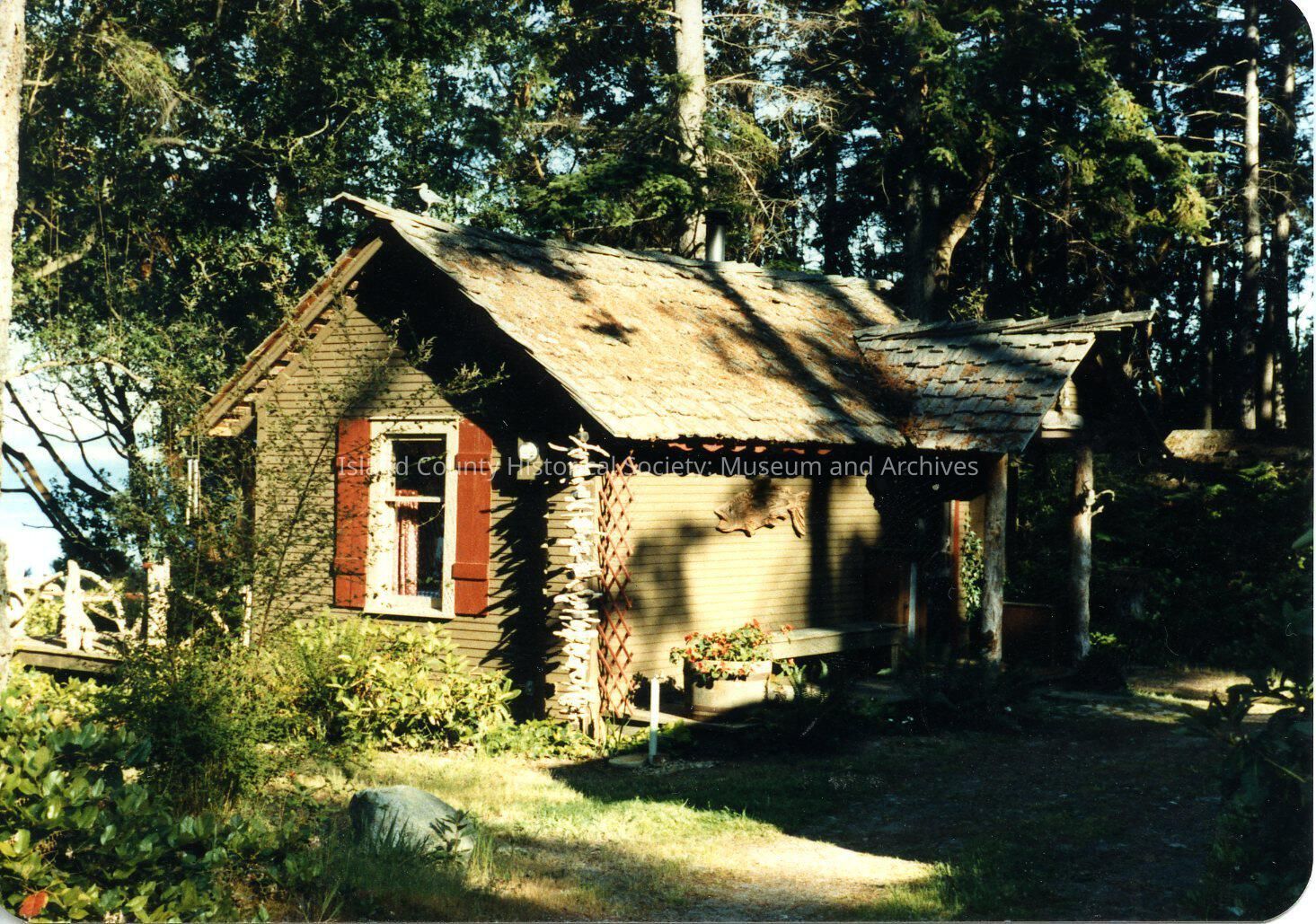 Guest House Bed & Breakfast, Greenbank. Cabin among trees with body of water in background. Cabin is painted tan with red-shuttered window. Front side has large fish decoration above bench and barrel planter, red door and roofed entry. Lattice work and driftwood sculpture at corner. Does not appear to be part of Bed and Breakfast.
