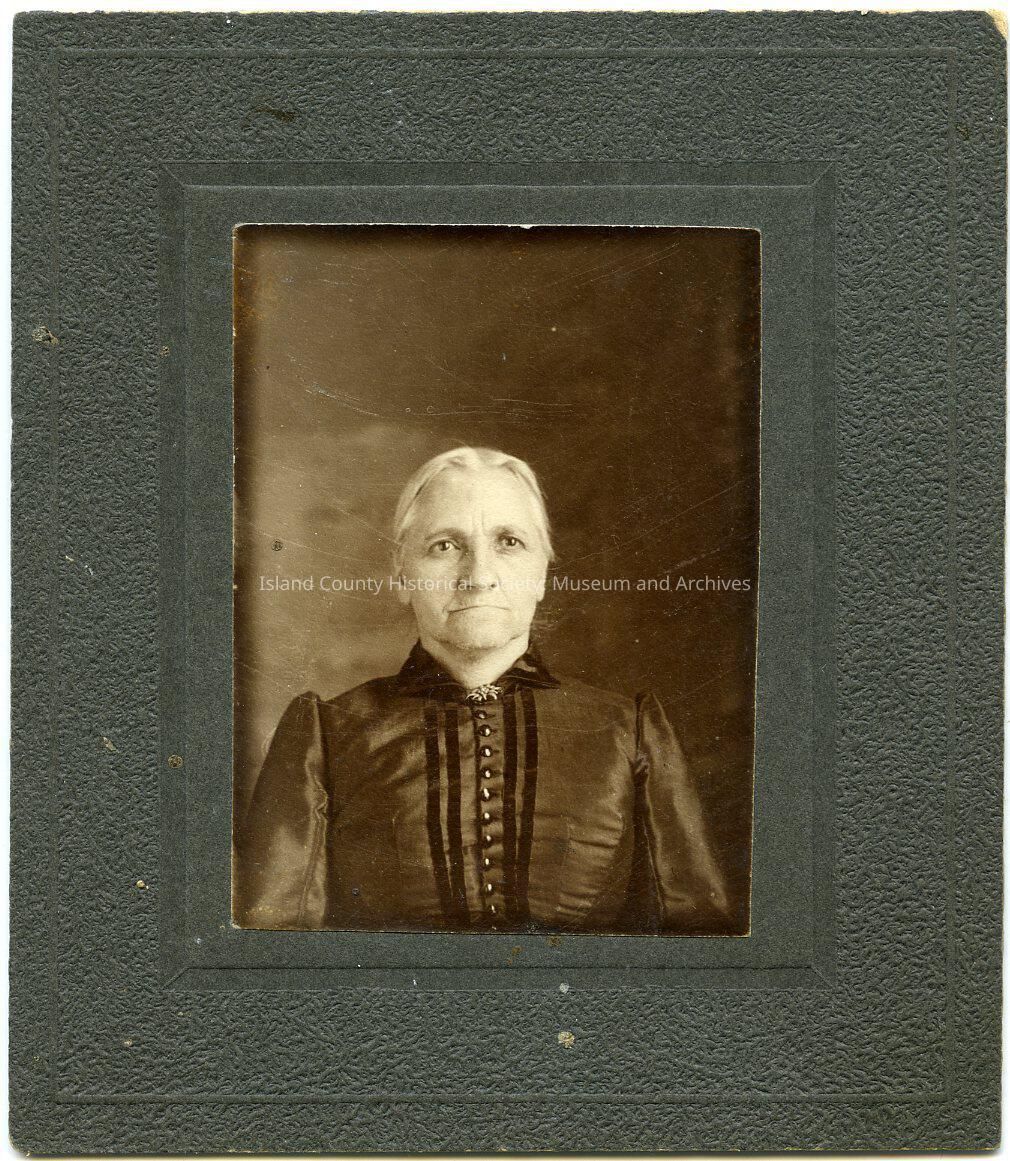A framed photo of a woman. A note handwritten on the front says "Maria Coupe, (pg 34 in Cook's Penn Cove, A Particular Friend. Found behind the mantel in the John Gould House, 2/20/1993 by Bruce Hebb."