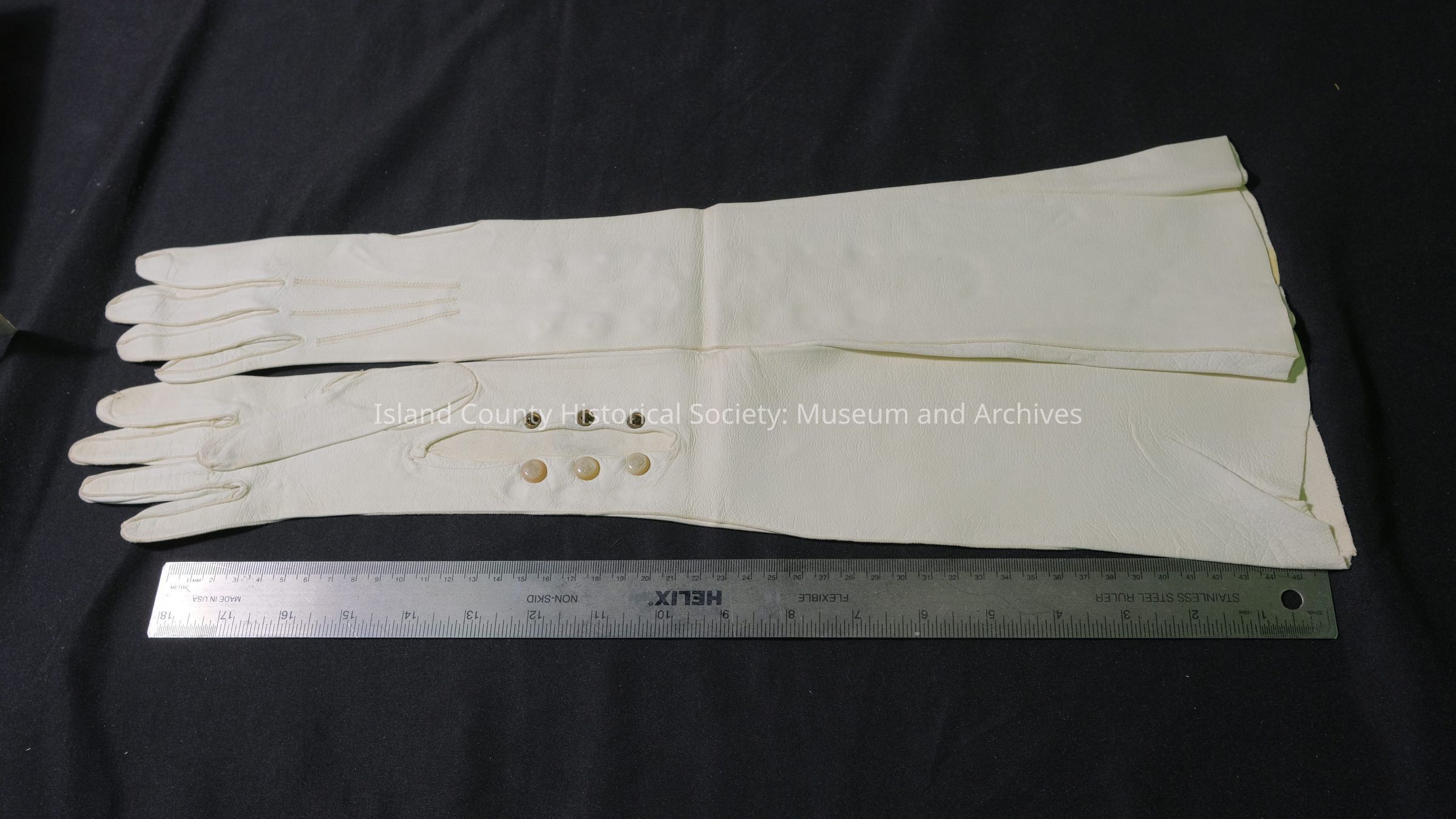 Elbow-length, white kid gloves.
