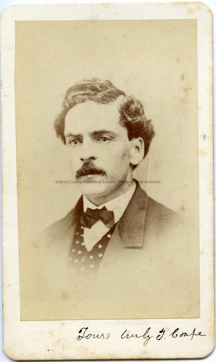 A photo of a young man wearing a suit, bow tie, dotted or figured dark vest. He has curly hari and a mustache. Handwritten on the back is "Thomas Coupe (son of Capt. Thomas Coupe.)