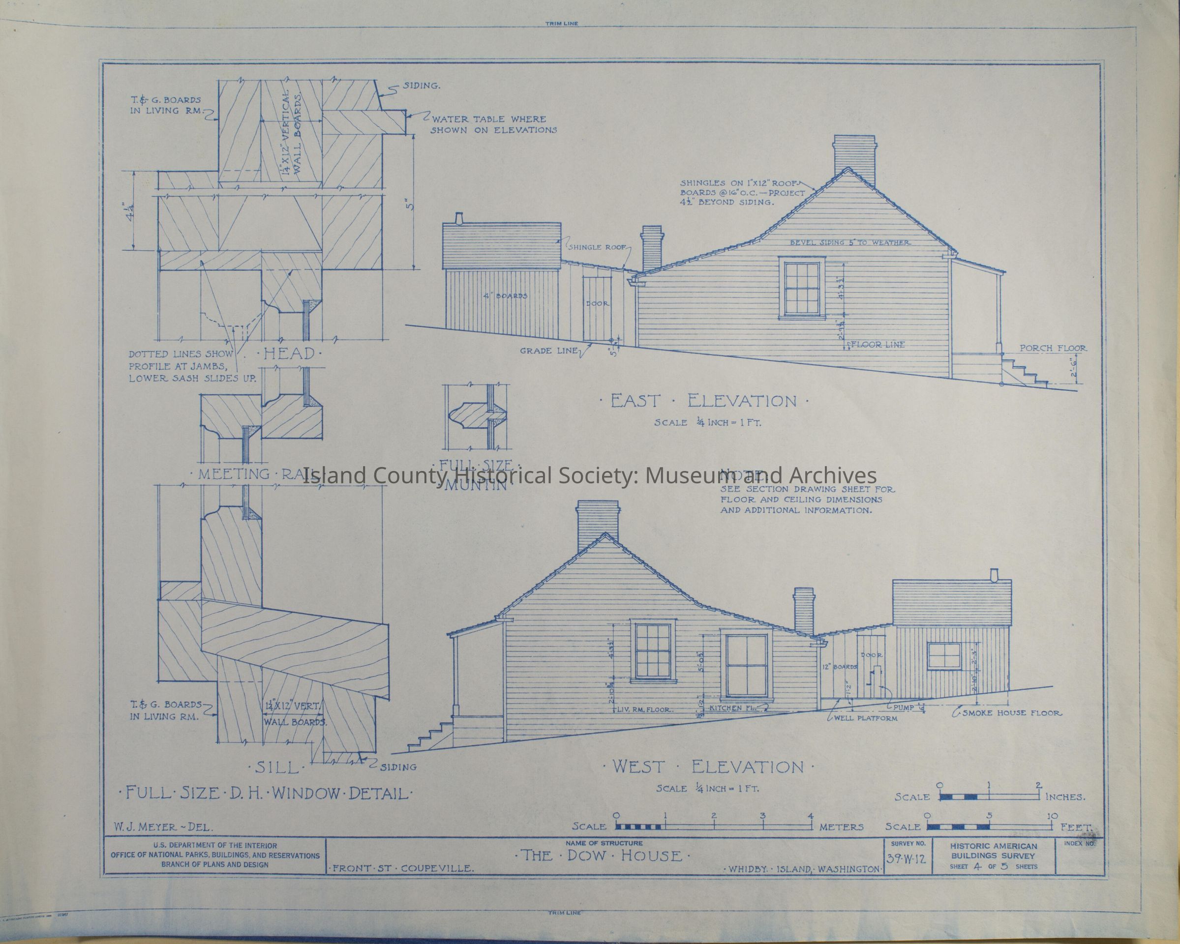 Architect Drawing of the Dow House. East and West Elevations, Window Details. Survey No. 39-W-17 - Sheet 4 of 5.
